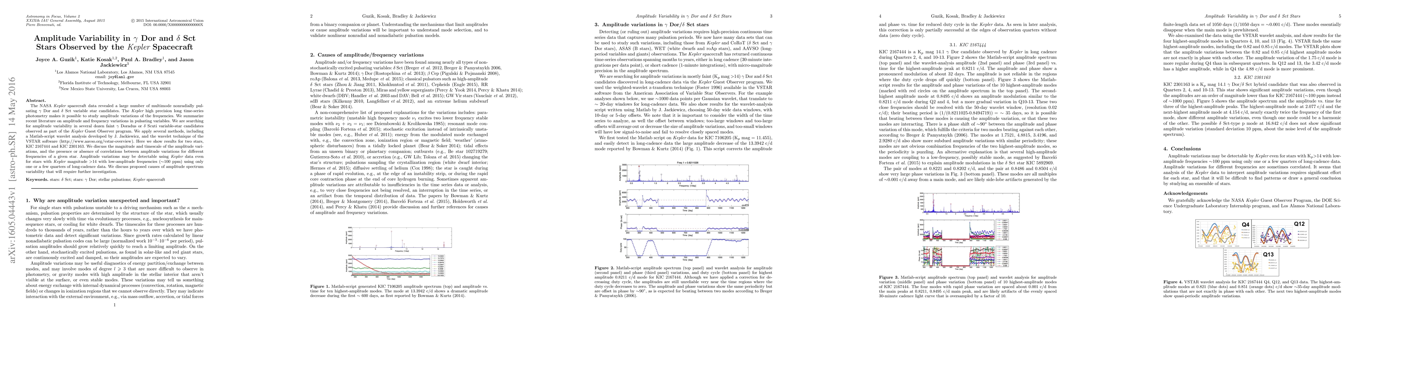 This paper analyzes amplitude variability in gamma Dor and delta Scuti stars using NASA Kepler spacecraft data, focusing on two stars, KIC 2167444 and KIC 2301163. It discusses the detection of amplitude variations and potential correlations between different frequencies, suggesting that such variations can be observed even in faint stars with low-amplitude pulsations.
