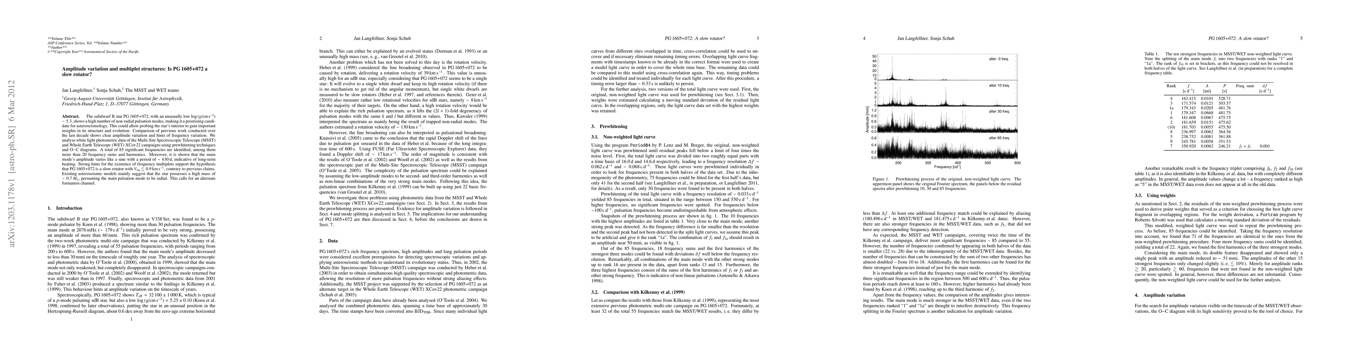The subdwarf B star PG1605+072 exhibits significant amplitude variation and frequency multiplets, suggesting it is a slow rotator with a low equatorial velocity. Analysis of photometric data indicates long-term beating and supports an alternate formation channel for the star, challenging previous radial pulsation mode assumptions.