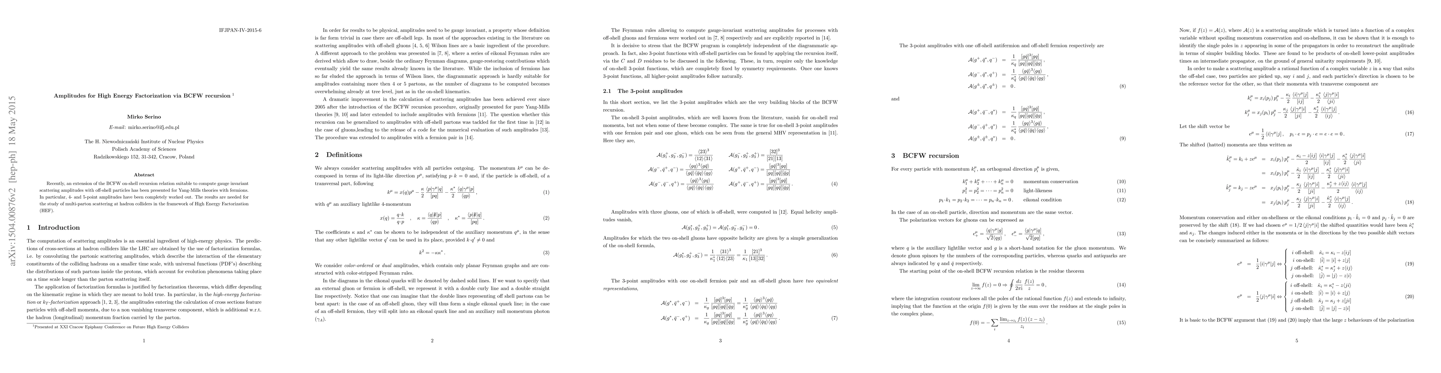 Recently, an extension of the BCFW on-shell recursion relation suitable to compute gauge invariant scattering amplitudes with off-shell particles has been presented for Yang-Mills theories with fermions. In particular, 4- and 5-point amplitudes have been completely worked out. The results are needed for the study of multi-parton scattering at hadron colliders in the framework of High Energy Factorization (HEF).