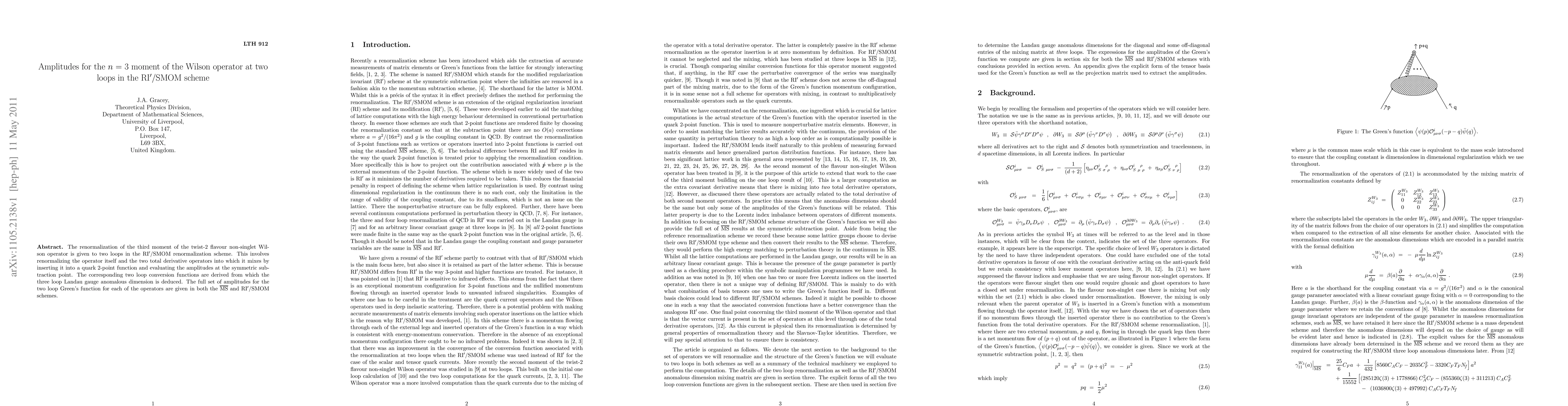 This paper presents the renormalization of the third moment of the twist-2 flavour non-singlet Wilson operator to two loops in the RI'/SMOM scheme, detailing the renormalized operator and associated total derivative operators. The study also derives the two-loop conversion functions and deduces the three-loop Landau gauge anomalous dimension.