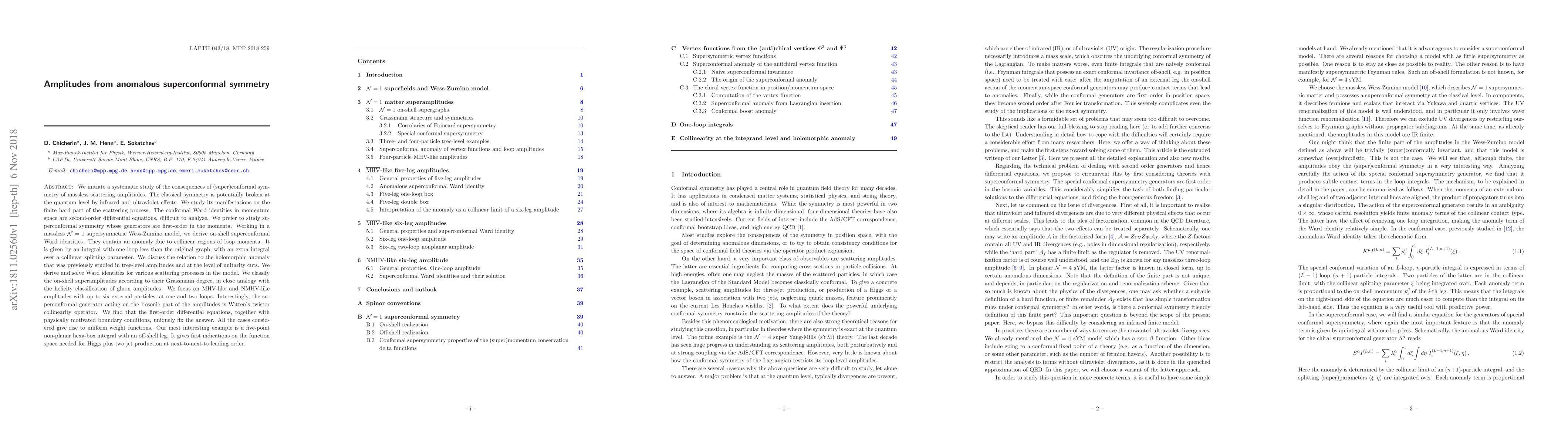 This paper explores the impact of anomalous superconformal symmetry on scattering amplitudes in a massless N=1 supersymmetric Wess-Zumino model. It finds that superconformal Ward identities, derived from first-order differential equations, uniquely determine amplitudes with uniform weight functions, including MHV-like and NMHV-like configurations up to six external particles at one and two loops.