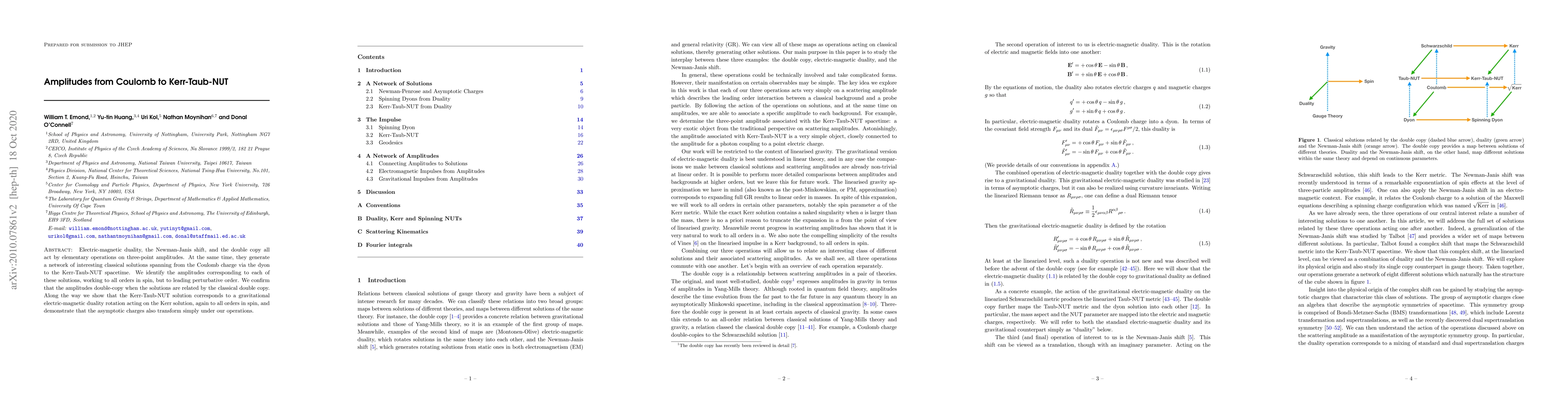 Electric-magnetic duality, the Newman-Janis shift, and the double copy all act by elementary operations on three-point amplitudes. At the same time, they generate a network of interesting classical solutions spanning from the Coulomb charge via the dyon to the Kerr-Taub-NUT spacetime. We identify the amplitudes corresponding to each of these solutions, working to all orders in spin, but to leading perturbative order. We confirm that the amplitudes double-copy when the solutions are related by the classical double copy. Along the way we show that the Kerr-Taub-NUT solution corresponds to a gravitational electric-magnetic duality rotation acting on the Kerr solution, again to all orders in spin, and demonstrate that the asymptotic charges also transform simply under our operations.