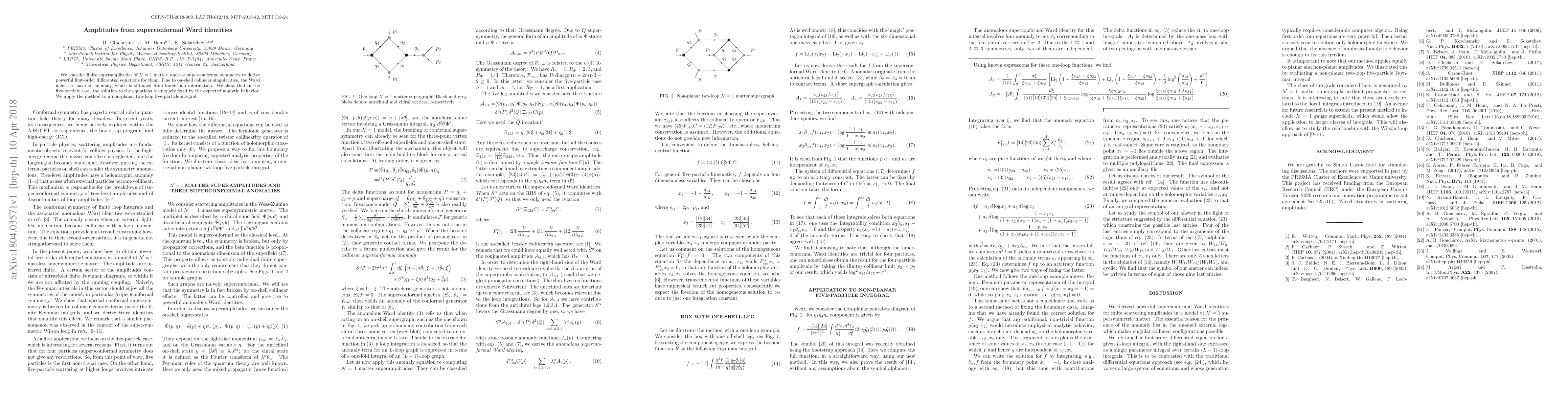 We consider finite superamplitudes of N=1 matter, and use superconformal symmetry to derive powerful first-order differential equations for them. Due to on-shell collinear singularities, the Ward identities have an anomaly, which is obtained from lower-loop information. We show that in the five-particle case, the solution to the equations is uniquely fixed by the expected analytic behavior. We apply the method to a non-planar two-loop five-particle integral.