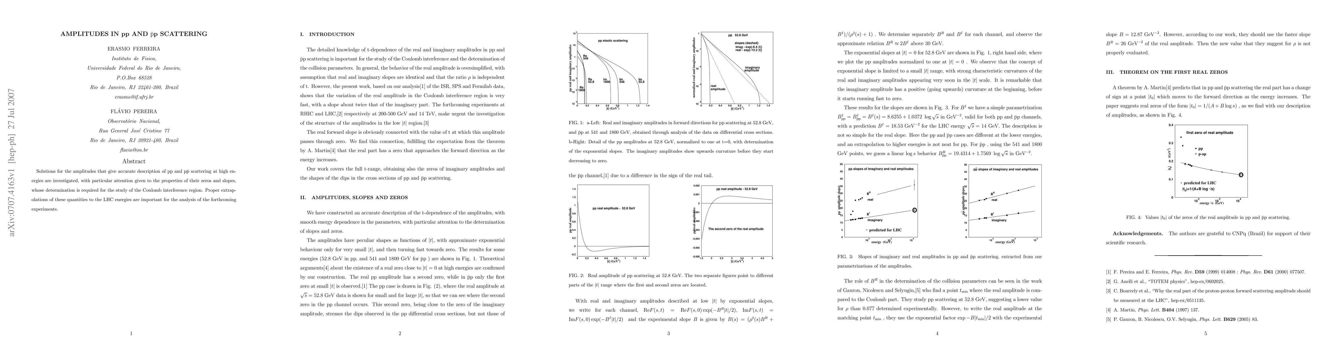This paper investigates solutions for amplitudes describing high-energy pp and p-pbar scattering, focusing on the properties of their zeros and slopes, crucial for understanding the Coulomb interference region. Extrapolations to LHC energies are essential for analyzing future experiments.