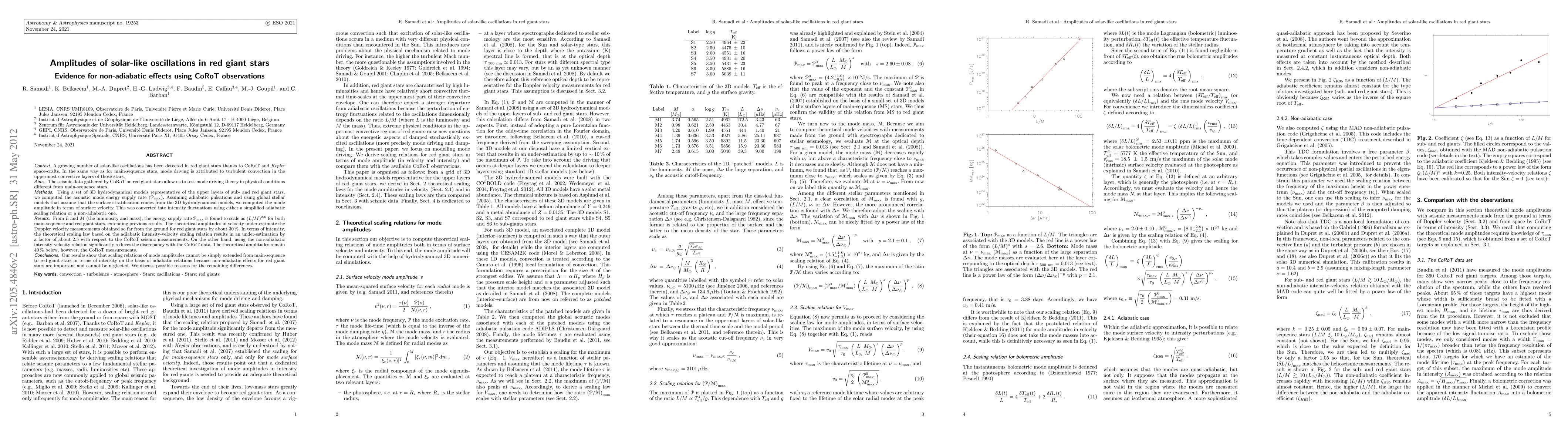 This paper investigates the amplitudes of solar-like oscillations in red giant stars using CoRoT observations, revealing that non-adiabatic effects significantly impact the mode amplitudes. Theoretical adiabatic models under-estimate the observed intensities by a factor of 2.5, while non-adiabatic models reduce the discrepancy but still fall short by 40%.