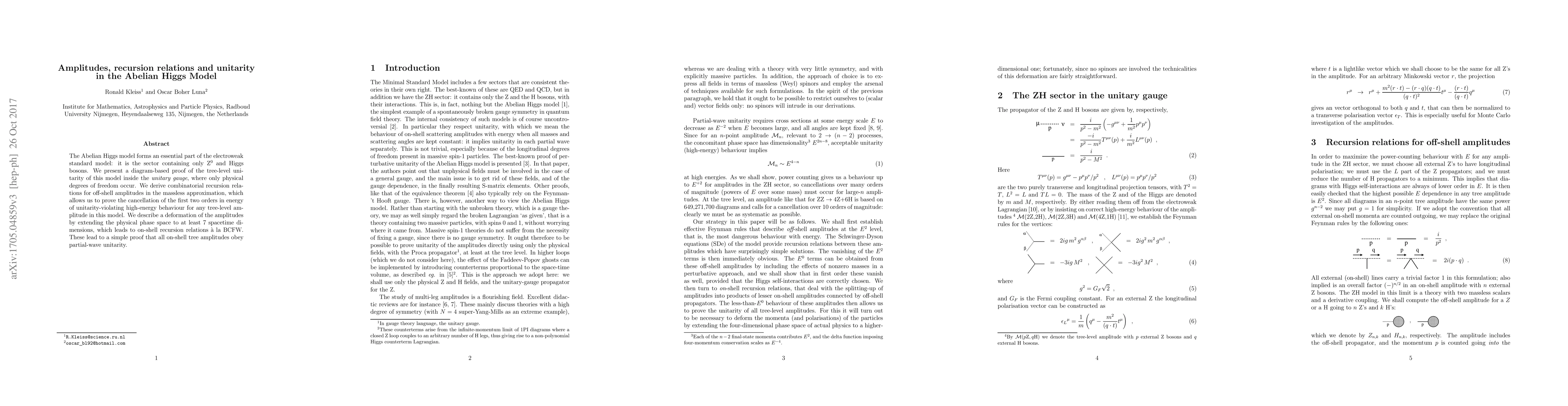 The Abelian Higgs model forms an essential part of the electroweak standard model: it is the sector containing only Z and Higgs bosons. We present a diagram-based proof of the tree-level unitarity of this model inside the unitary gauge, where only physical degrees of freedom occur. We derive combinatorial recursion relations for off-shell amplitudes in the massless approximation, which allows us to prove the cancellation of the first two orders in energy of unitarity-violating high-energy behaviour for any tree-level amplitude in this model. We describe a deformation of the amplitudes by extending the physical phase space to at least 7 spacetime dimensions, which leads to on-shell recursion relations a la BCFW. These lead to a simple proof that all on-shell tree amplitudes obey partial-wave unitarity.