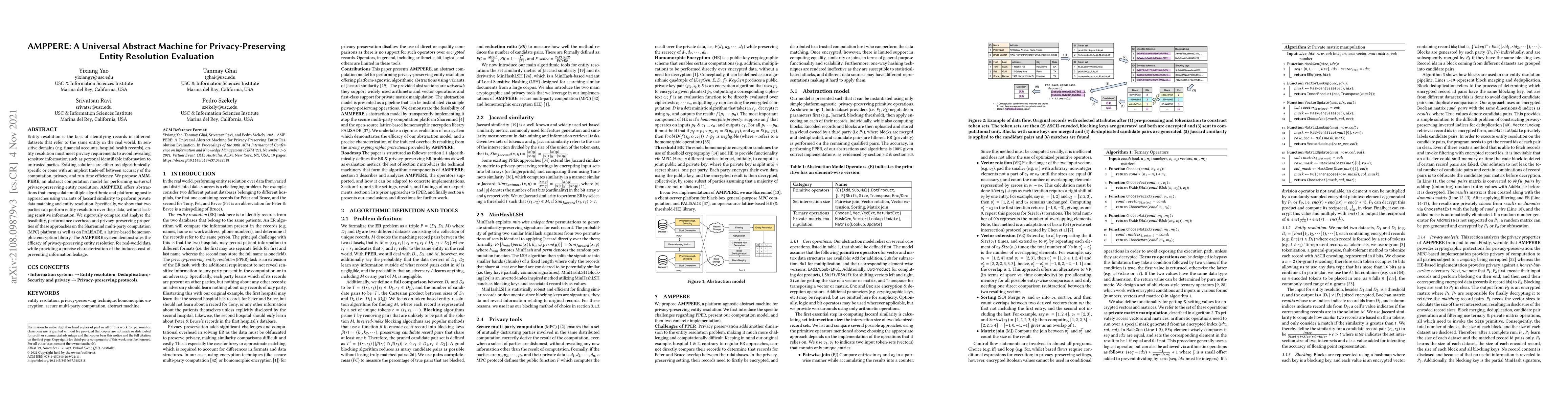 AMPPERE is a universal abstract machine for privacy-preserving entity resolution, enabling secure matching across datasets without revealing sensitive information. It employs Jaccard similarity variants and is evaluated on multi-party computation and homomorphic encryption platforms, demonstrating effective privacy-preserving entity resolution with detailed cost analysis.