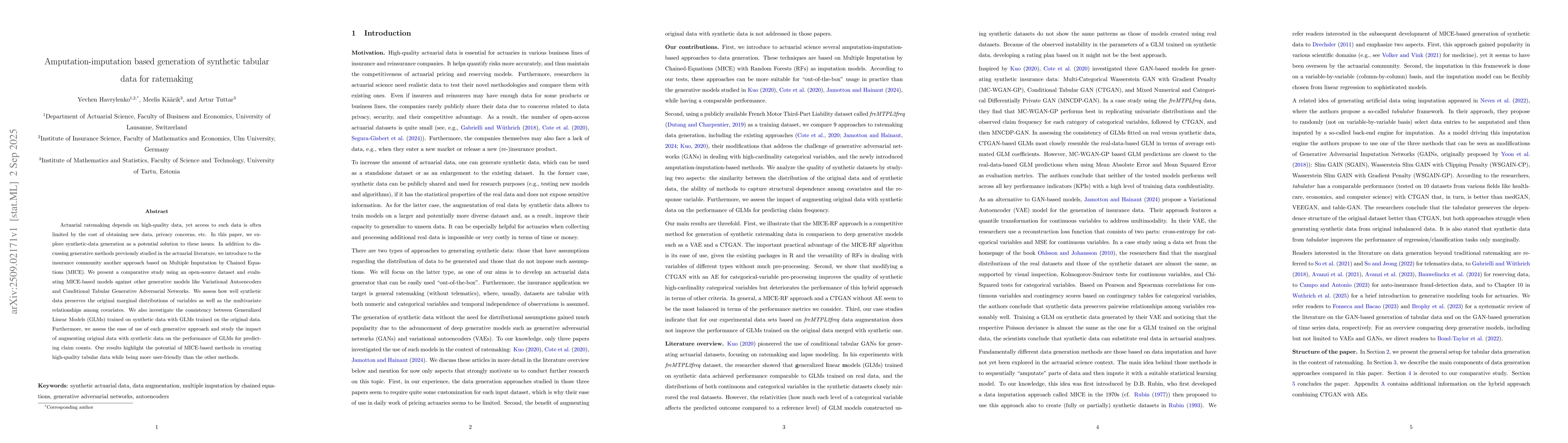 Actuarial ratemaking depends on high-quality data, yet access to such data is often limited by the cost of obtaining new data, privacy concerns, etc. In this paper, we explore synthetic-data generation as a potential solution to these issues. In addition to discussing generative methods previously studied in the actuarial literature, we introduce to the insurance community another approach based on Multiple Imputation by Chained Equations (MICE). We present a comparative study using an open-source dataset and evaluating MICE-based models against other generative models like Variational Autoencoders and Conditional Tabular Generative Adversarial Networks. We assess how well synthetic data preserves the original marginal distributions of variables as well as the multivariate relationships among covariates. We also investigate the consistency between Generalized Linear Models (GLMs) trained on synthetic data with GLMs trained on the original data. Furthermore, we assess the ease of use of each generative approach and study the impact of augmenting original data with synthetic data on the performance of GLMs for predicting claim counts. Our results highlight the potential of MICE-based methods in creating high-quality tabular data while being more user-friendly than the other methods.