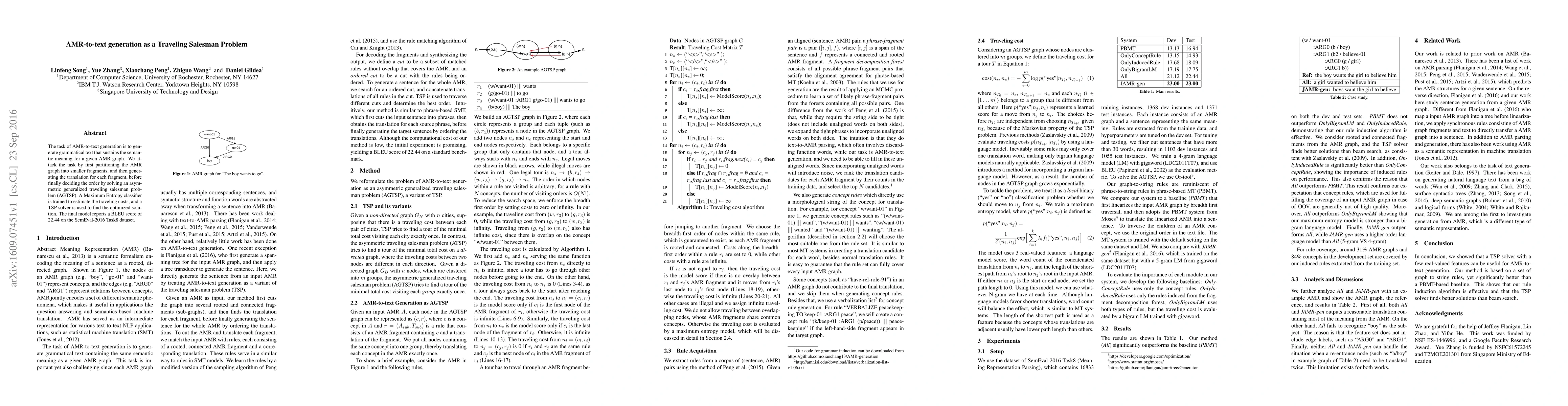 Researchers use a traveling salesman problem approach to generate grammatical text from abstract meaning representations, achieving a BLEU score of 22.44 on the SemEval-2016 Task8 dataset.