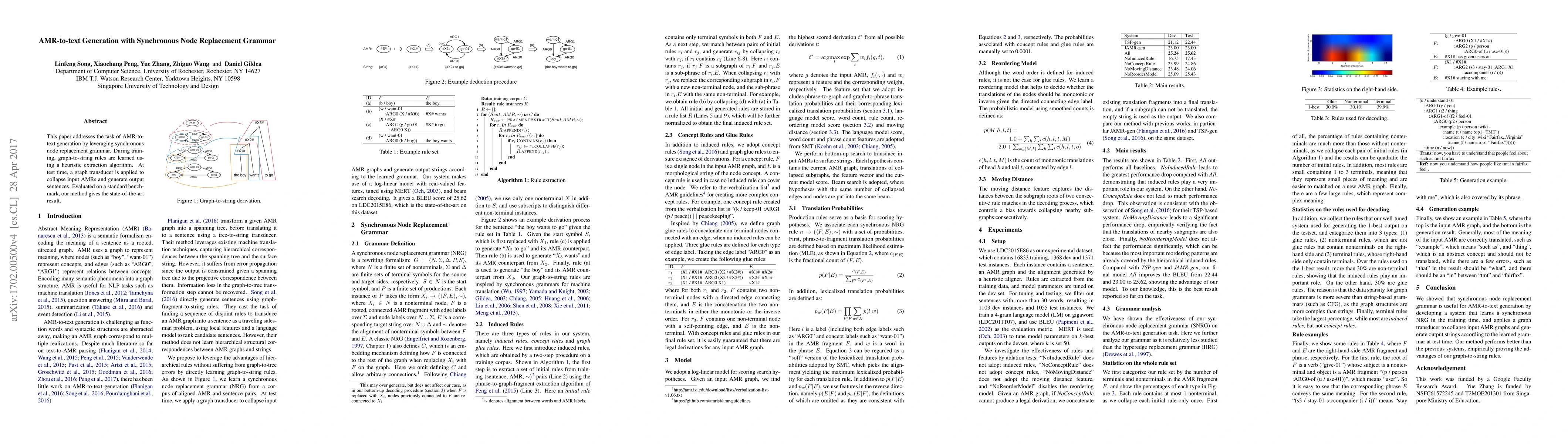 This paper addresses the task of AMR-to-text generation by leveraging synchronous node replacement grammar. During training, graph-to-string rules are learned using a heuristic extraction algorithm. At test time, a graph transducer is applied to collapse input AMRs and generate output sentences. Evaluated on SemEval-2016 Task 8, our method gives a BLEU score of 25.62, which is the best reported so far.