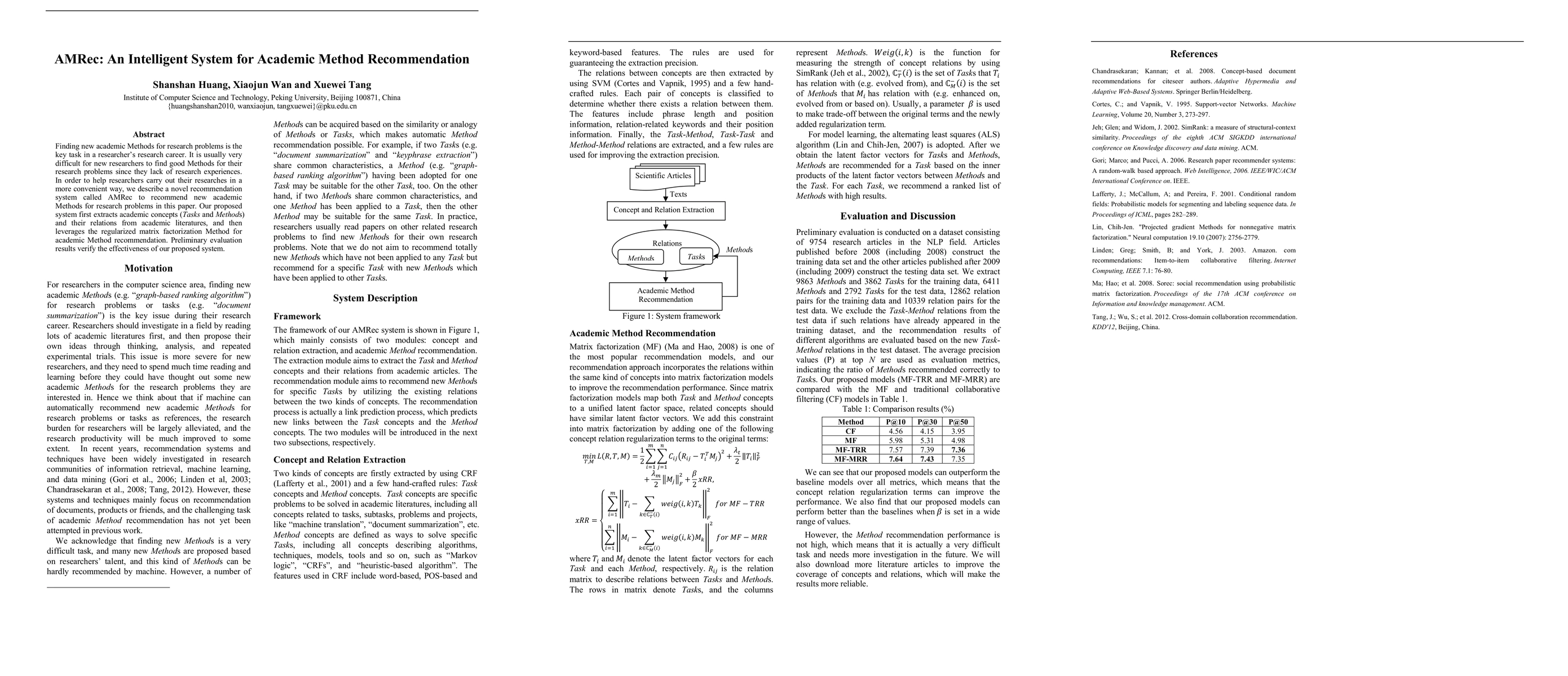 Finding new academic Methods for research problems is the key task in a researcher's research career. It is usually very difficult for new researchers to find good Methods for their research problems since they lack of research experiences. In order to help researchers carry out their researches in a more convenient way, we describe a novel recommendation system called AMRec to recommend new academic Methods for research problems in this paper. Our proposed system first extracts academic concepts (Tasks and Methods) and their relations from academic literatures, and then leverages the regularized matrix factorization Method for academic Method recommendation. Preliminary evaluation results verify the effectiveness of our proposed system.