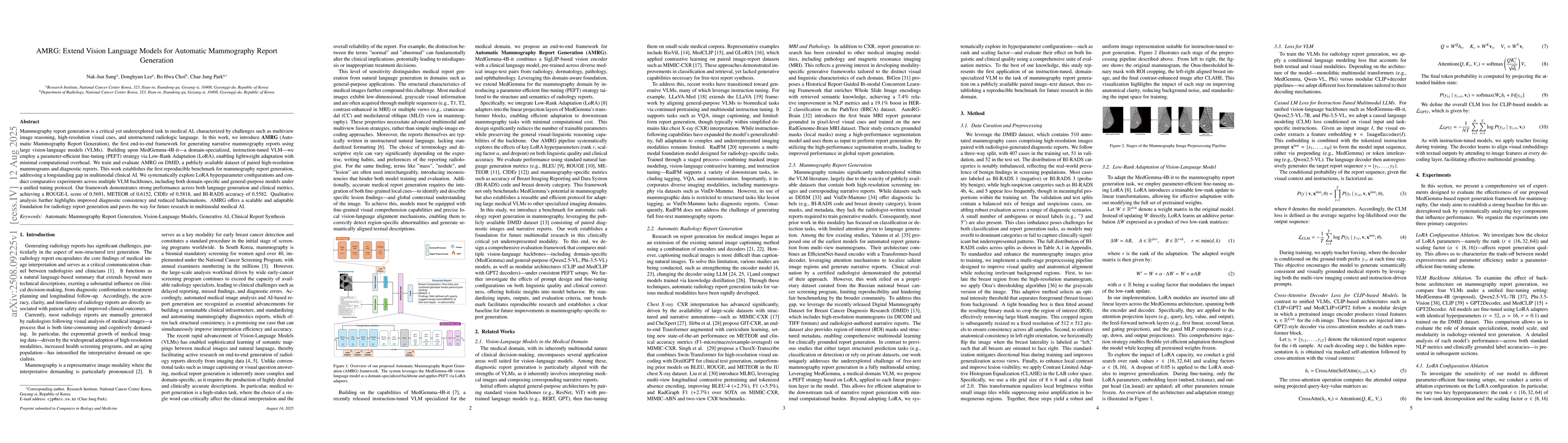 Mammography report generation is a critical yet underexplored task in medical AI, characterized by challenges such as multiview image reasoning, high-resolution visual cues, and unstructured radiologic language. In this work, we introduce AMRG (Automatic Mammography Report Generation), the first end-to-end framework for generating narrative mammography reports using large vision-language models (VLMs). Building upon MedGemma-4B-it-a domain-specialized, instruction-tuned VLM-we employ a parameter-efficient fine-tuning (PEFT) strategy via Low-Rank Adaptation (LoRA), enabling lightweight adaptation with minimal computational overhead. We train and evaluate AMRG on DMID, a publicly available dataset of paired high-resolution mammograms and diagnostic reports. This work establishes the first reproducible benchmark for mammography report generation, addressing a longstanding gap in multimodal clinical AI. We systematically explore LoRA hyperparameter configurations and conduct comparative experiments across multiple VLM backbones, including both domain-specific and general-purpose models under a unified tuning protocol. Our framework demonstrates strong performance across both language generation and clinical metrics, achieving a ROUGE-L score of 0.5691, METEOR of 0.6152, CIDEr of 0.5818, and BI-RADS accuracy of 0.5582. Qualitative analysis further highlights improved diagnostic consistency and reduced hallucinations. AMRG offers a scalable and adaptable foundation for radiology report generation and paves the way for future research in multimodal medical AI.