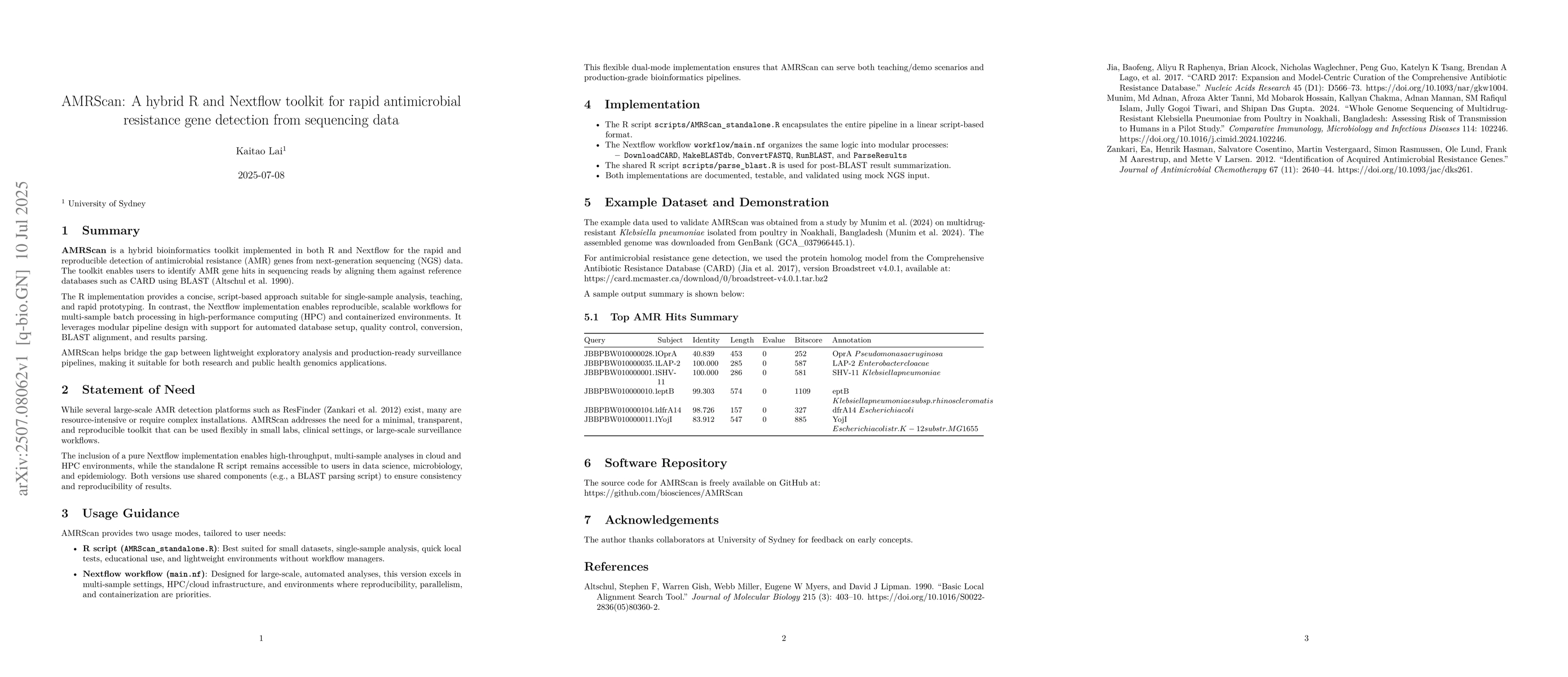 AMRScan is a dual-language (R and Nextflow) toolkit for swift detection of antimicrobial resistance genes from sequencing data. It offers both single-sample analysis flexibility and scalable batch processing for high-performance computing, bridging the gap between research and public health genomics applications.