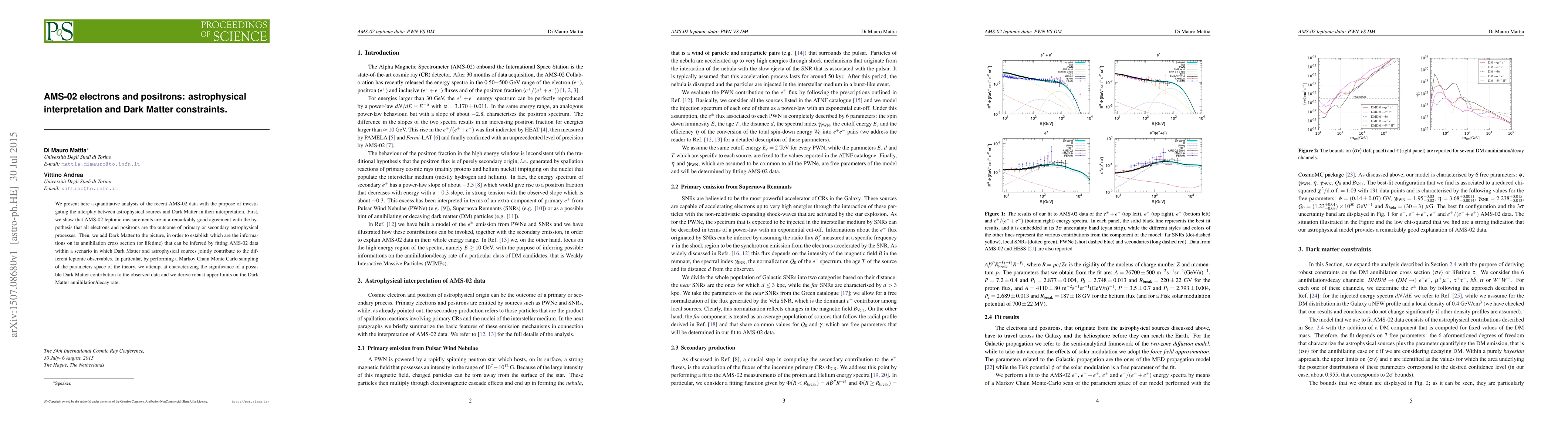 This paper analyzes AMS-02 data to explore the origins of cosmic electrons and positrons, finding strong evidence for astrophysical sources. It also investigates Dark Matter's potential contribution, deriving upper limits on its annihilation/decay rate through a comprehensive parameter space analysis.