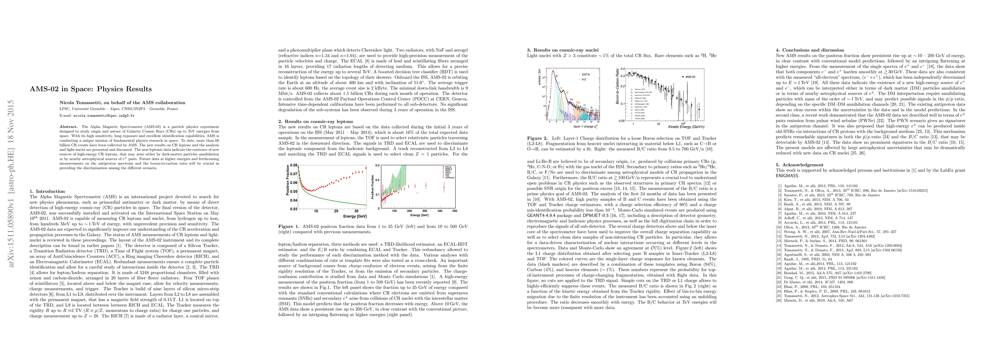 The Alpha Magnetic Spectrometer (AMS-02) is a particle physics experiment designed to study origin and nature of Galactic Cosmic Rays (CRs) up to TeV energies from space. With its high sensitivity, long exposure and excellent identification capabilities, AMS is conducting a unique mission of fundamental physics research in space. To date, more than 60 billion CR events have been collected by AMS. The new results on CR leptons and the analysis and light-nuclei are presented and discussed. The new leptonic data indicate the existence of new sources of high-energy CR leptons, that may arise either by dark-matter particles annihilation or by nearby astrophysical sources of $e^{\pm}$ pairs. Future data at higher energies and forthcoming measurements on the antiproton spectrum and the boron-to-carbon ratio will be crucial in providing the discrimination among the different scenario.