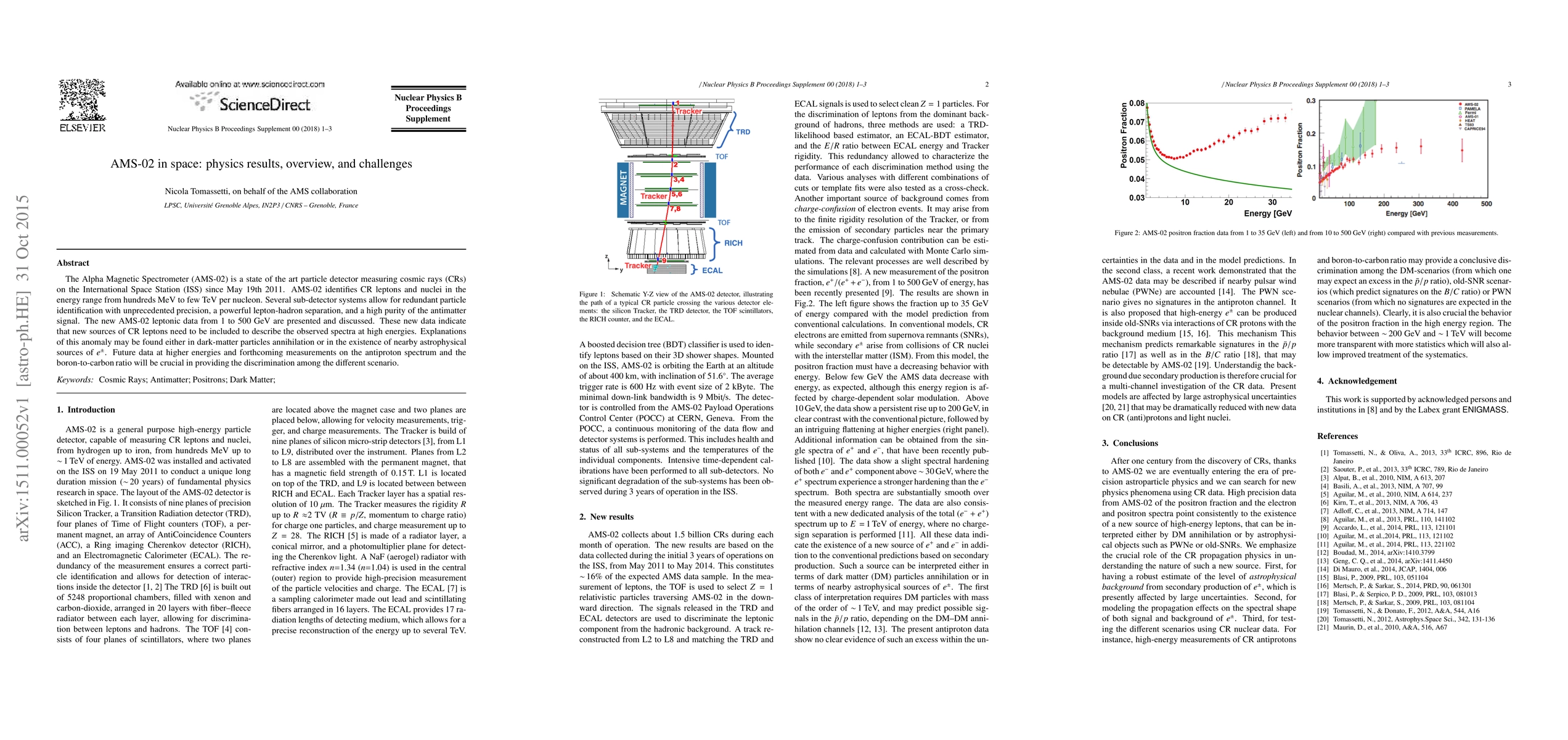 The Alpha Magnetic Spectrometer (AMS-02) is a state of the art particle detector measuring cosmic rays (CRs) on the International Space Station (ISS) since May 19th 2011. AMS-02 identifies CR leptons and nuclei in the energy range from hundreds MeV to few TeV per nucleon. Several sub-detector systems allow for redundant particle identification with unprecedented precision, a powerful lepton-hadron separation, and a high purity of the antimatter signal. The new AMS-02 leptonic data from 1 to 500 GeV are presented and discussed. These new data indicate that new sources of CR leptons need to be included to describe the observed spectra at high energies. Explanations of this anomaly may be found either in dark-matter particles annihilation or in the existence of nearby astrophysical sources of $e^{\pm}$. Future data at higher energies and forthcoming measurements on the antiproton spectrum and the boron-to-carbon ratio will be crucial in providing the discrimination among the different scenario.