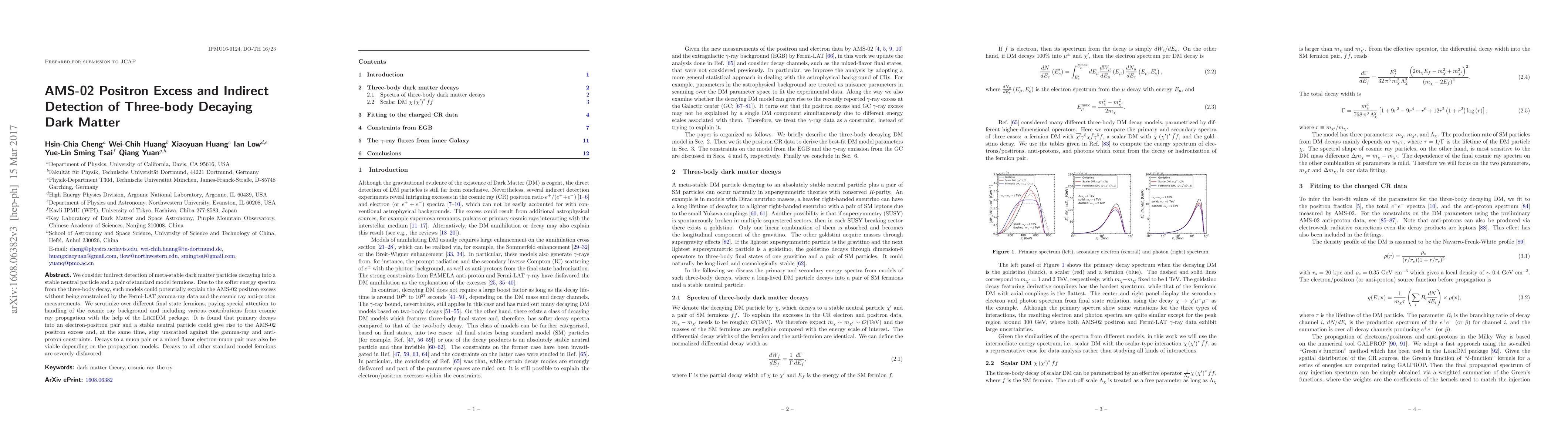 This paper explores indirect detection of meta-stable dark matter particles decaying into a stable neutral particle and a pair of standard model fermions, suggesting that such models could explain the AMS-02 positron excess without violating gamma-ray and anti-proton constraints. Primary decays into an electron-positron pair are found to be the most viable option, while decays into muon pairs or mixed flavor pairs depend on cosmic ray propagation models.