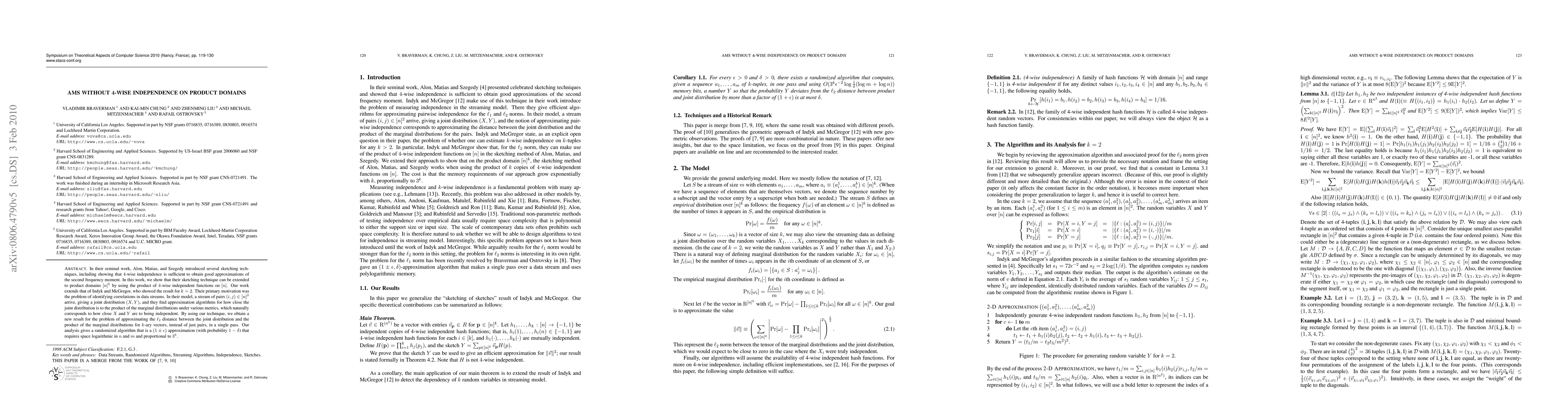 In their seminal work, Alon, Matias, and Szegedy introduced several sketching techniques, including showing that 4-wise independence is sufficient to obtain good approximations of the second frequency moment. In this work, we show that their sketching technique can be extended to product domains $[n]^k$ by using the product of 4-wise independent functions on $[n]$. Our work extends that of Indyk and McGregor, who showed the result for $k = 2$. Their primary motivation was the problem of identifying correlations in data streams. In their model, a stream of pairs $(i,j) \in [n]^2$ arrive, giving a joint distribution $(X,Y)$, and they find approximation algorithms for how close the joint distribution is to the product of the marginal distributions under various metrics, which naturally corresponds to how close $X$ and $Y$ are to being independent. By using our technique, we obtain a new result for the problem of approximating the $\ell_2$ distance between the joint distribution and the product of the marginal distributions for $k$-ary vectors, instead of just pairs, in a single pass. Our analysis gives a randomized algorithm that is a $(1 \pm \epsilon)$ approximation (with probability $1-\delta$) that requires space logarithmic in $n$ and $m$ and proportional to $3^k$.