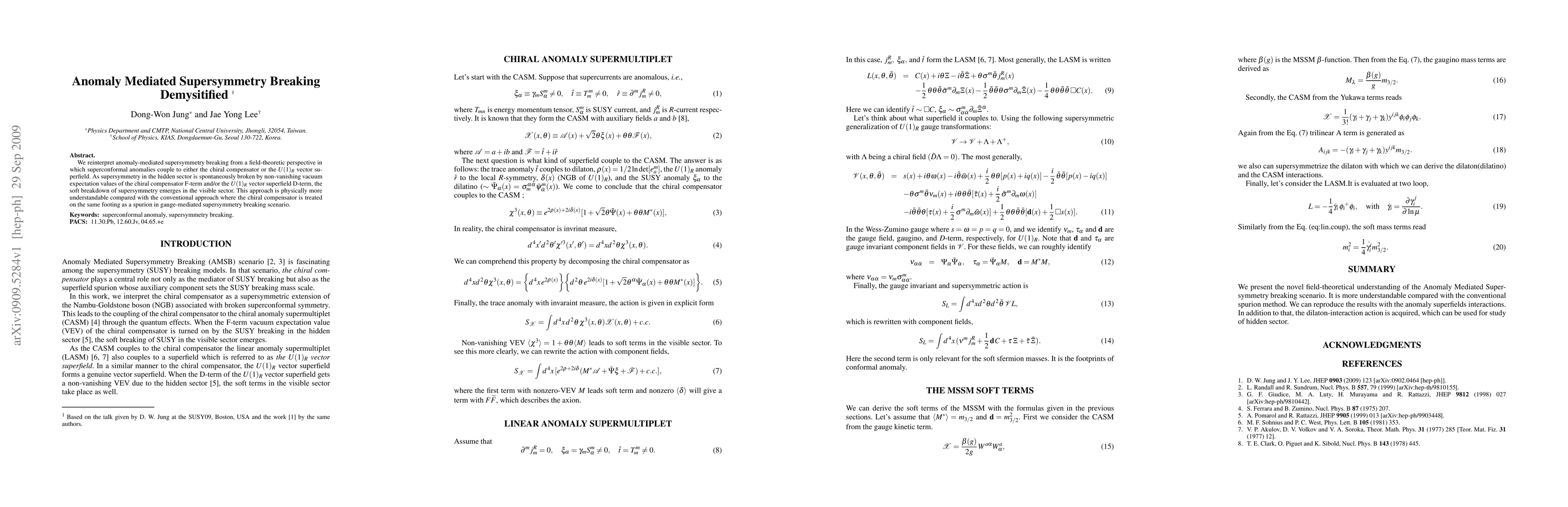 We reinterpret anomaly-mediated supersymmetry breaking from a field-theoretic perspective in which superconformal anomalies couple to either the chiral compensator or the $U(1)_R$ vector superfield. As supersymmetry in the hidden sector is spontaneously broken by non-vanishing vacuum expectation values of the chiral compensator F-term and/or the $U(1)_R$ vector superfield D-term, the soft breakdown of supersymmetry emerges in the visible sector. This approach is physically more understandable compared with the conventional approach where the chiral compensator is treated on the same footing as a spurion in gauge-mediated supersymmetry breaking scenario.