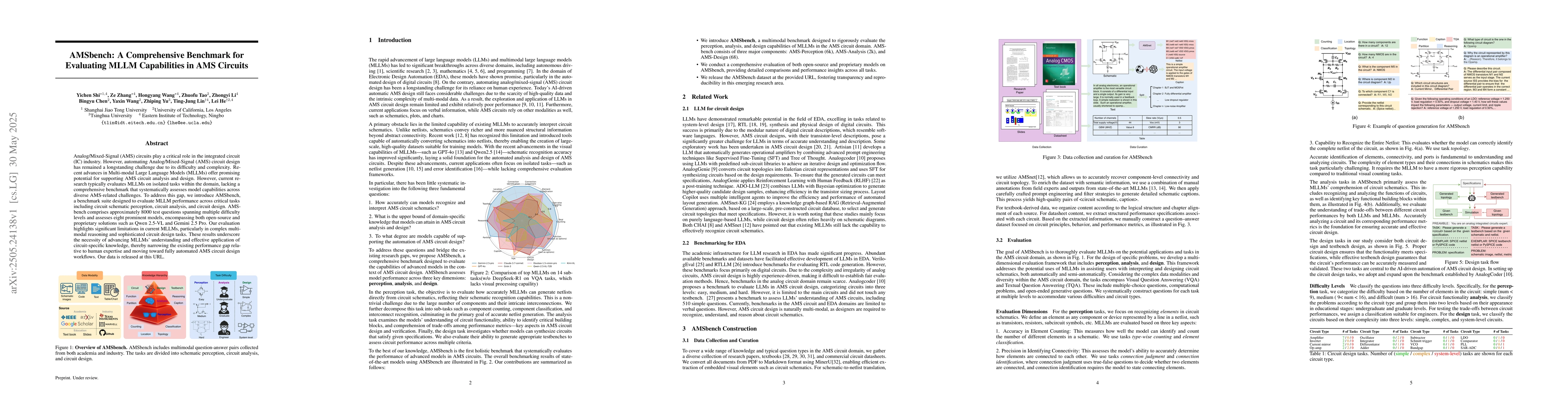 The paper introduces AMSbench, a benchmark suite consisting of approximately 8000 test questions across various difficulty levels, to evaluate Multi-modal Large Language Models (MLLMs) in critical AMS-related tasks such as circuit schematic perception, analysis, and design. It assesses eight prominent MLLM models, including open-source and proprietary solutions.