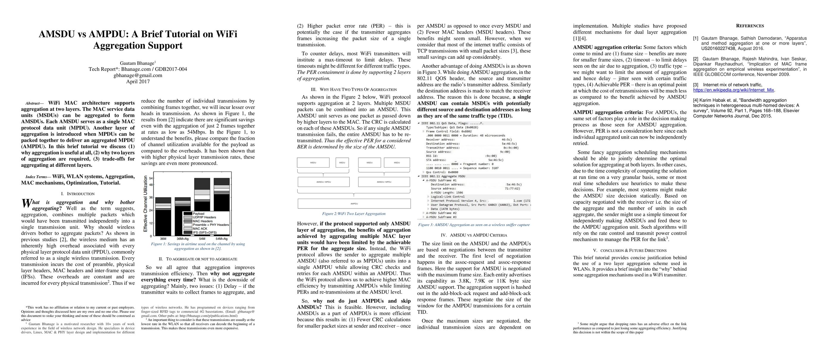 This paper provides a tutorial on WiFi aggregation, explaining the benefits and necessity of two layers of aggregation: AMSDUs formed by aggregating MSDUs and AMPDUs formed by aggregating MPDUs, while discussing the trade-offs involved in each layer.