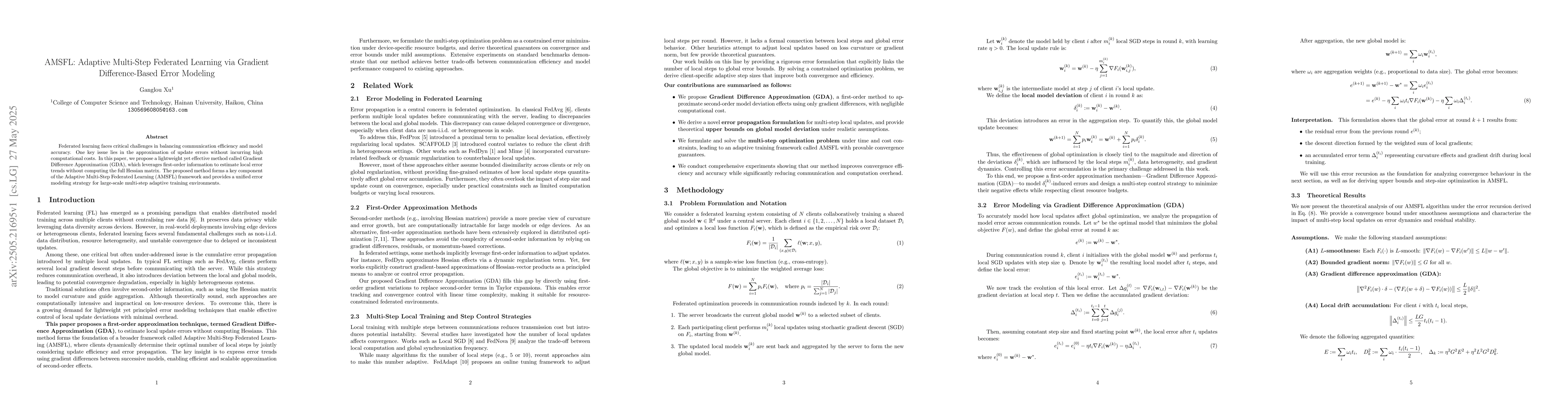 Federated learning faces critical challenges in balancing communication efficiency and model accuracy. One key issue lies in the approximation of update errors without incurring high computational costs. In this paper, we propose a lightweight yet effective method called Gradient Difference Approximation (GDA), which leverages first-order information to estimate local error trends without computing the full Hessian matrix. The proposed method forms a key component of the Adaptive Multi-Step Federated Learning (AMSFL) framework and provides a unified error modeling strategy for large-scale multi-step adaptive training environments.