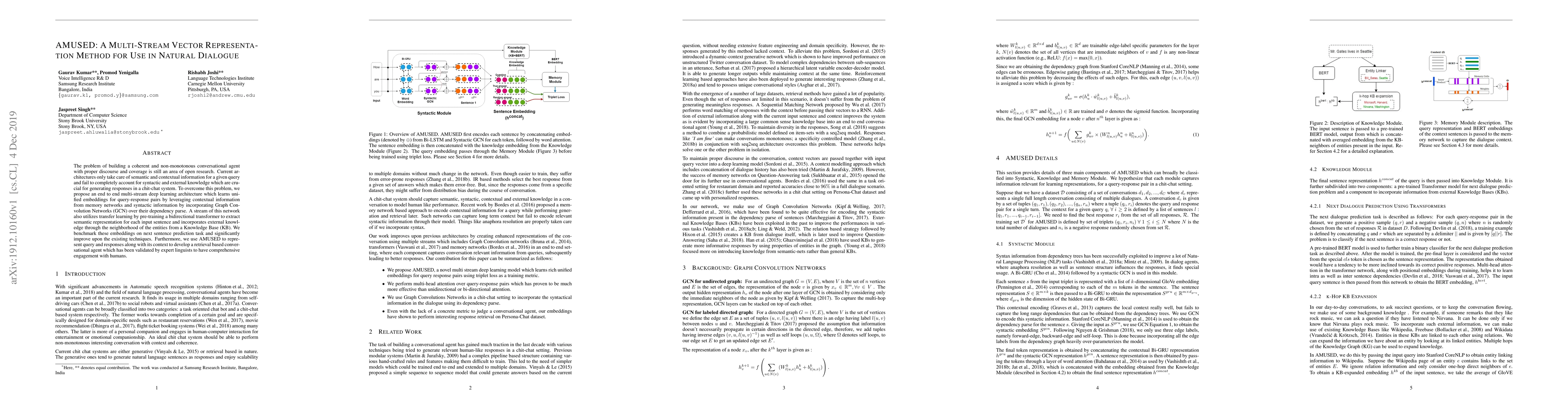 The problem of building a coherent and non-monotonous conversational agent with proper discourse and coverage is still an area of open research. Current architectures only take care of semantic and contextual information for a given query and fail to completely account for syntactic and external knowledge which are crucial for generating responses in a chit-chat system. To overcome this problem, we propose an end to end multi-stream deep learning architecture which learns unified embeddings for query-response pairs by leveraging contextual information from memory networks and syntactic information by incorporating Graph Convolution Networks (GCN) over their dependency parse. A stream of this network also utilizes transfer learning by pre-training a bidirectional transformer to extract semantic representation for each input sentence and incorporates external knowledge through the the neighborhood of the entities from a Knowledge Base (KB). We benchmark these embeddings on next sentence prediction task and significantly improve upon the existing techniques. Furthermore, we use AMUSED to represent query and responses along with its context to develop a retrieval based conversational agent which has been validated by expert linguists to have comprehensive engagement with humans.