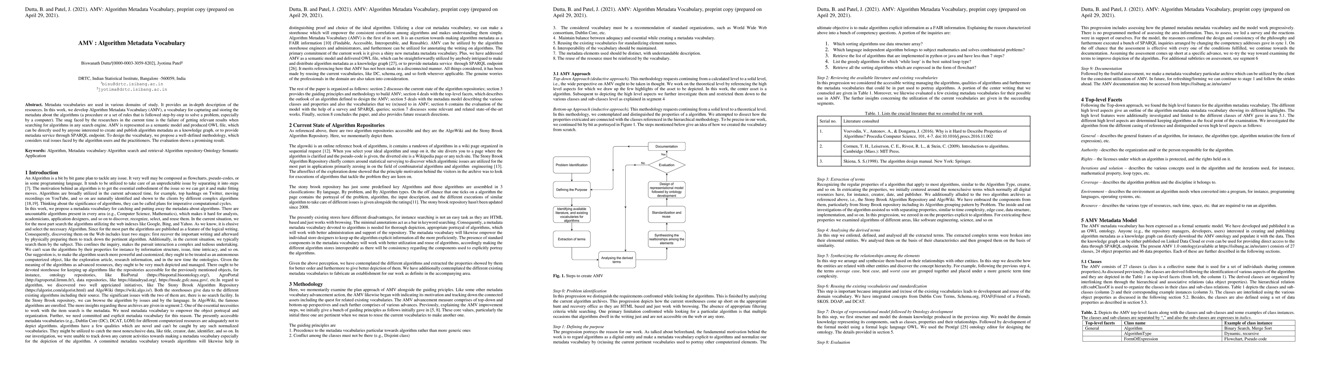 The paper introduces Algorithm Metadata Vocabulary (AMV), a semantic model for capturing algorithm metadata, aiming to improve search results for algorithms. The methodology considers practical issues faced by users and practitioners, and evaluation indicates promising results.