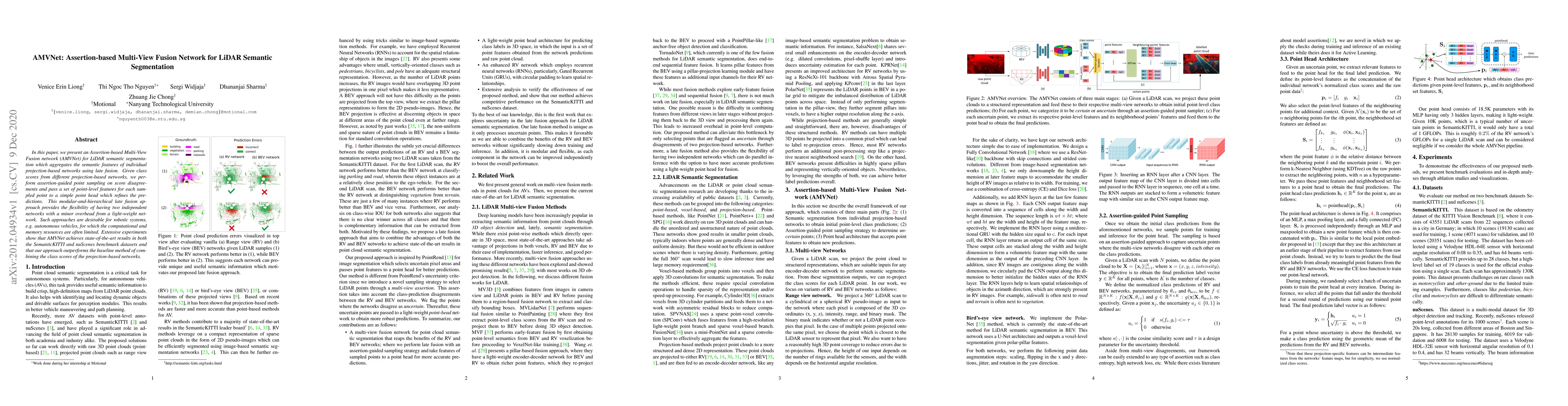 AMVNet is a novel network for LiDAR semantic segmentation that uses assertion-based multi-view fusion to combine features from individual projection-based networks, achieving state-of-the-art results on benchmark datasets. The approach refines predictions through assertion-guided point sampling and a lightweight point head, making it suitable for resource-constrained robotic systems.