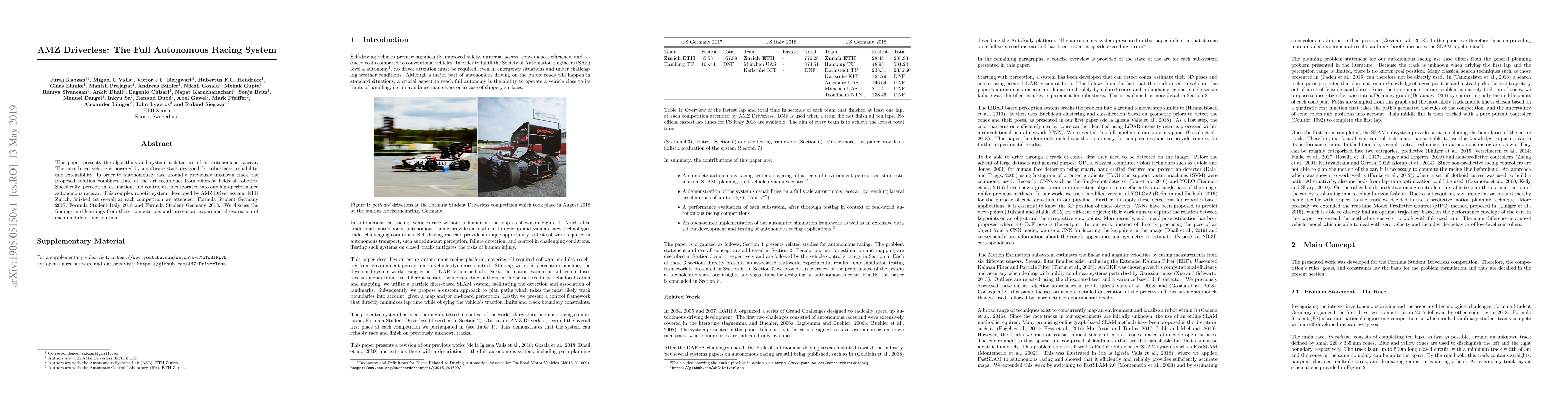 This paper presents the algorithms and system architecture of an autonomous racecar. The introduced vehicle is powered by a software stack designed for robustness, reliability, and extensibility. In order to autonomously race around a previously unknown track, the proposed solution combines state of the art techniques from different fields of robotics. Specifically, perception, estimation, and control are incorporated into one high-performance autonomous racecar. This complex robotic system, developed by AMZ Driverless and ETH Zurich, finished 1st overall at each competition we attended: Formula Student Germany 2017, Formula Student Italy 2018 and Formula Student Germany 2018. We discuss the findings and learnings from these competitions and present an experimental evaluation of each module of our solution.