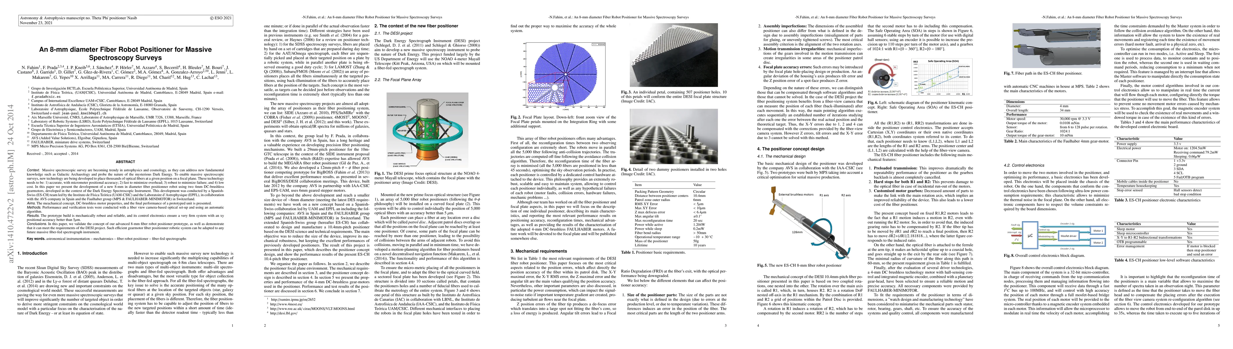 Massive spectroscopic survey are becoming trendy in astrophysics and cosmology, as they can address new fundamental knowledge such as Galactic Archaeology and probe the nature of the mysterious Dark Energy. To enable massive spectroscopic surveys, new technology are being developed to place thousands of optical fibers at a given position on a focal plane. These technology needs to be: 1) accurate, with micrometer positional accuracy; 2) fast to minimize overhead; 3) robust to minimize failure; and 4) low cost. In this paper we present the development of a new 8-mm in diameter fiber positionner robot using two 4mm DC-brushless gearmotors, developed in the context of the Dark Energy Spectroscopic Instrument. This development was conducted by a Spanish-Swiss (ES-CH) team led by the Instituto de F\'isica Te\'orica (UAM-CSIC) and the Laboratoire d'Astrophysique (EPFL), in collaboration with the AVS company in Spain and the Faulhaber group (MPS & FAULHABER-MINIMOTOR) in Switzerland.