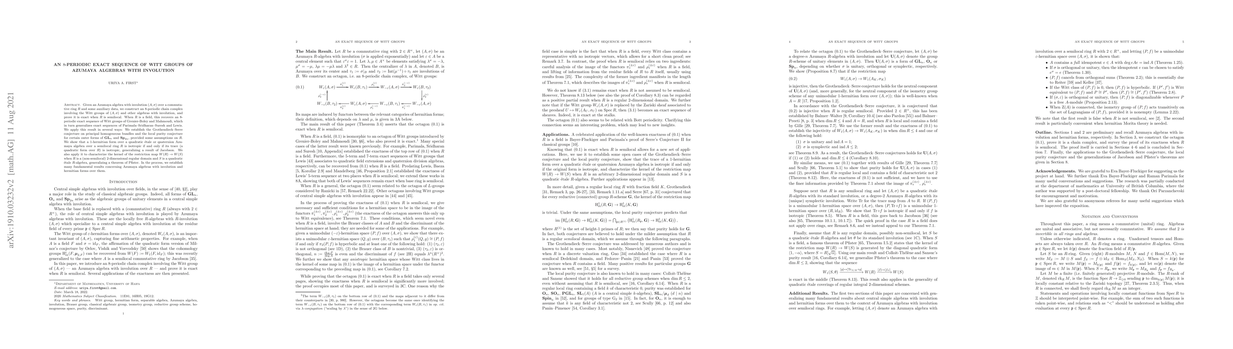 Researchers develop an 8-periodic exact sequence of Witt groups for Azumaya algebras with involution, leading to breakthroughs in understanding Grothendieck-Serre conjecture, local purity conjecture, and properties of hermitian forms over these algebras.