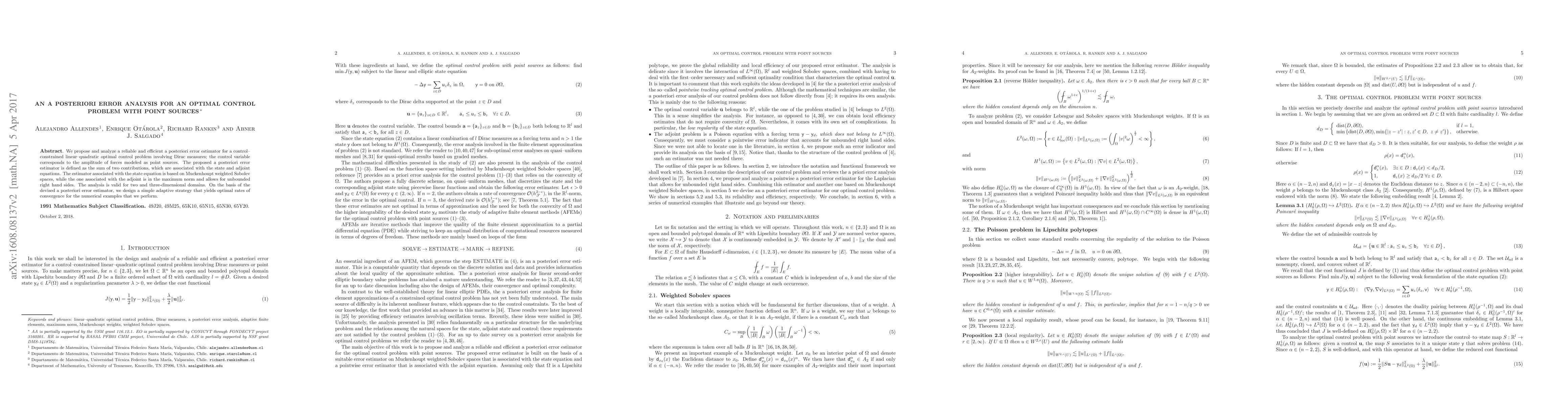 This paper proposes an a posteriori error estimator for a linear-quadratic optimal control problem with point sources, based on contributions from state and adjoint equations. The analysis ensures optimal convergence rates in two and three dimensions, enabling an adaptive strategy for numerical solutions.
