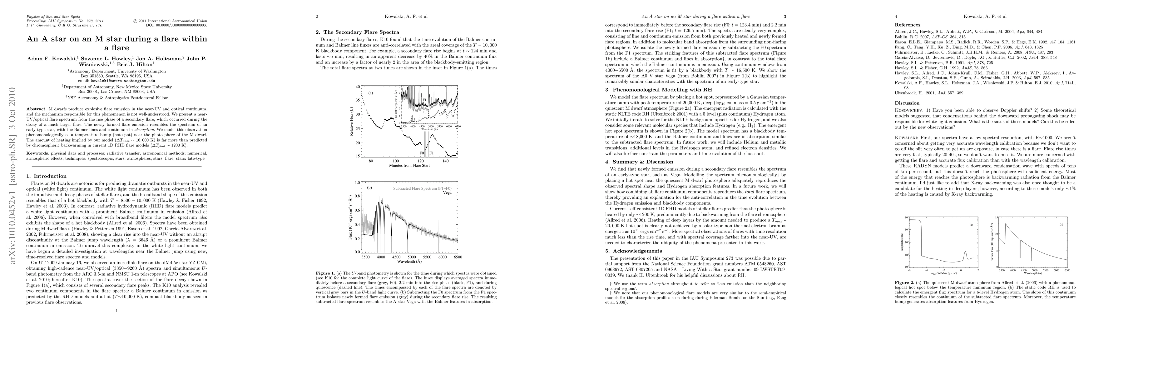This paper investigates a secondary flare on an M dwarf occurring during a larger flare, revealing a near-UV/optical spectrum resembling an early-type star. The observed heating (\Delta T_phot ~ 16,000K) is significantly higher than predicted by current 1D RHD models (\Delta T_phot ~ 1200K), suggesting a need for revised flare mechanisms.