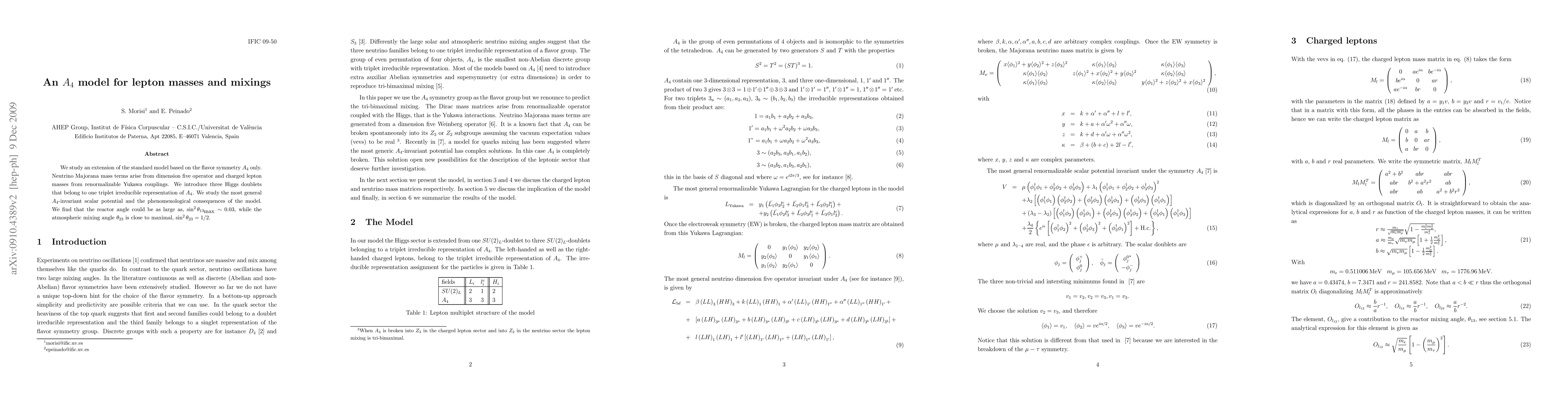 This paper explores an A4 symmetry-based extension of the Standard Model, generating neutrino Majorana masses via a dimension five operator and charged lepton masses through Yukawa couplings. The model introduces three Higgs doublets and predicts significant values for the reactor and atmospheric mixing angles.