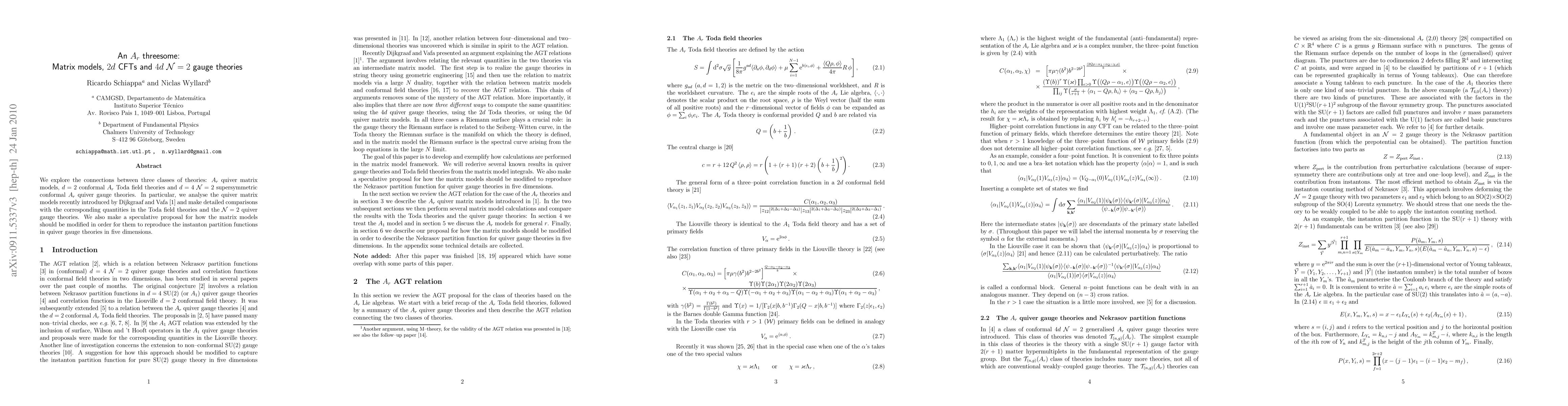 This paper investigates the intricate relationships between A_r quiver matrix models, 2d conformal Toda field theories, and 4d N=2 supersymmetric gauge theories, aiming to understand how these theoretical frameworks connect and proposing modifications to matrix models to match instanton partition functions in higher-dimensional gauge theories.