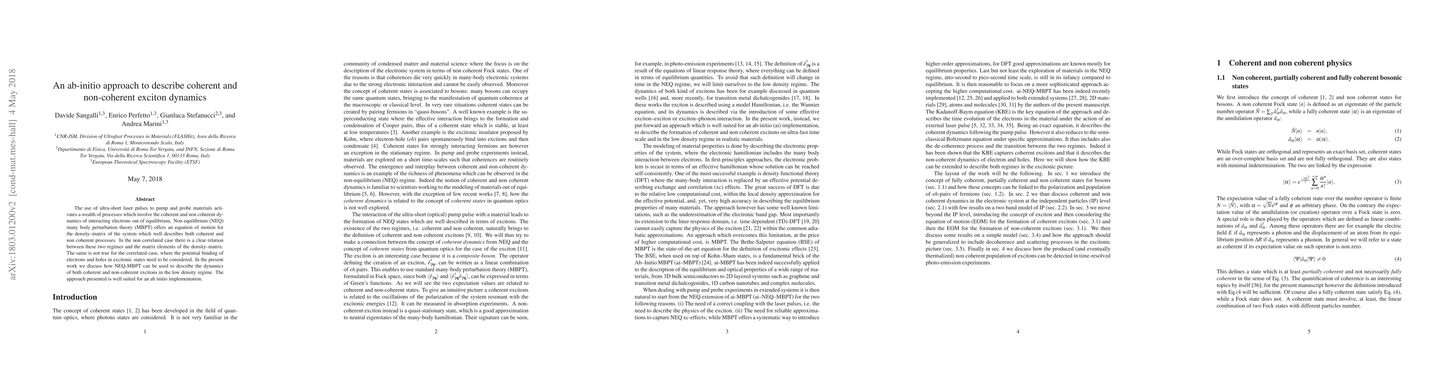 The use of ultra-short laser pulses to pump and probe materials activates a wealth of processes which involve the coherent and non coherent dynamics of interacting electrons out of equilibrium. Non equilibrium (NEQ) many body perturbation theory (MBPT) offers an equation of motion for the density-matrix of the system which well describes both coherent and non coherent processes. In the non correlated case there is a clear relation between these two regimes and the matrix elements of the density-matrix. The same is not true for the correlated case, where the potential binding of electrons and holes in excitonic states need to be considered. In the present work we discuss how NEQ-MBPT can be used to describe the dynamics of both coherent and non-coherent excitons in the low density regime. The approach presented is well suited for an ab initio implementation.