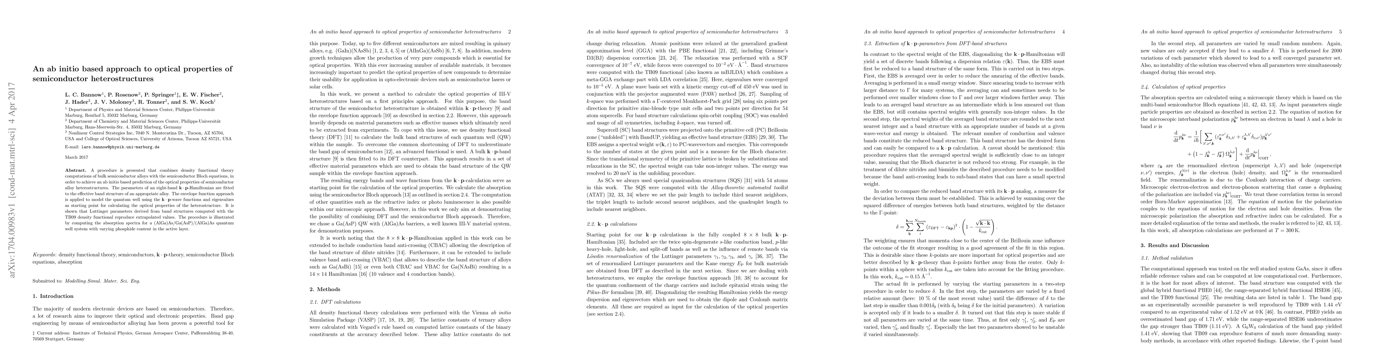 A procedure is presented that combines density functional theory computations of bulk semiconductor alloys with the semiconductor Bloch equations, in order to achieve an ab initio based prediction of the optical properties of semiconductor alloy heterostructures. The parameters of an eight-band kp-Hamiltonian are fitted to the effective band structure of an appropriate alloy. The envelope function approach is applied to model the quantum well using the kp-wave functions and eigenvalues as starting point for calculating the optical properties of the heterostructure. It is shown that Luttinger parameters derived from band structures computed with the TB09 density functional reproduce extrapolated values. The procedure is illustrated by computing the absorption spectra for a (AlGa)As/Ga(AsP)/(AlGa)As quantum well system with varying phosphide content in the active layer.