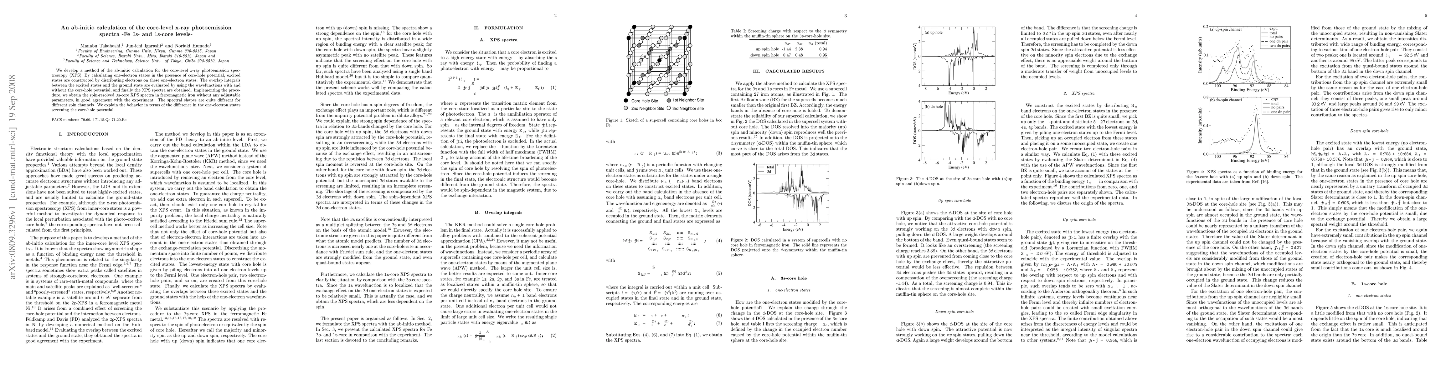 This research presents an ab-initio method for calculating core-level x-ray photoemission spectra, specifically for Fe 3s and 1s core levels in ferromagnetic iron. The method constructs excited states from one-electron states influenced by core-hole potentials and evaluates their overlap with ground states to obtain XPS spectra, demonstrating good agreement with experimental data and highlighting distinct spectral shapes for different spin channels.