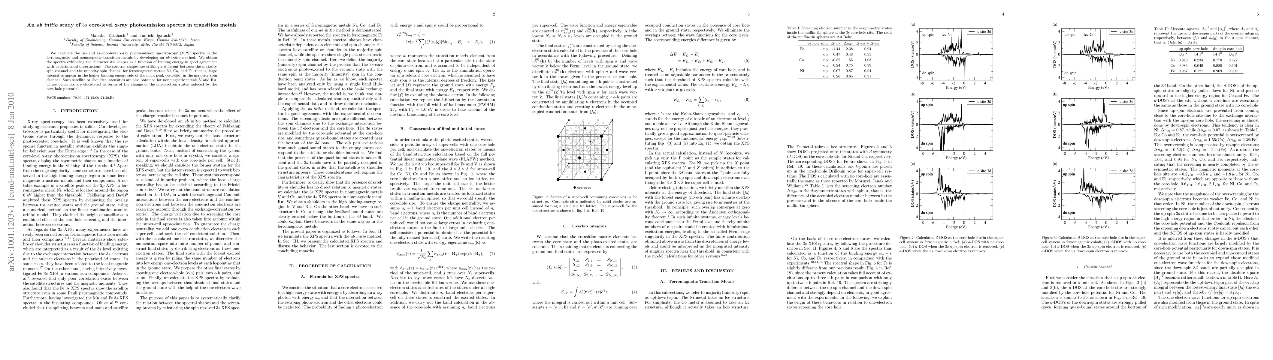 This study employs an ab initio method to calculate $3s$- and $4s$-core-level XPS spectra in transition metals, showing distinct spectral shapes between majority and minority spin channels in ferromagnetic metals and similar features in nonmagnetic metals, attributed to changes in one-electron states due to the core-hole potential.