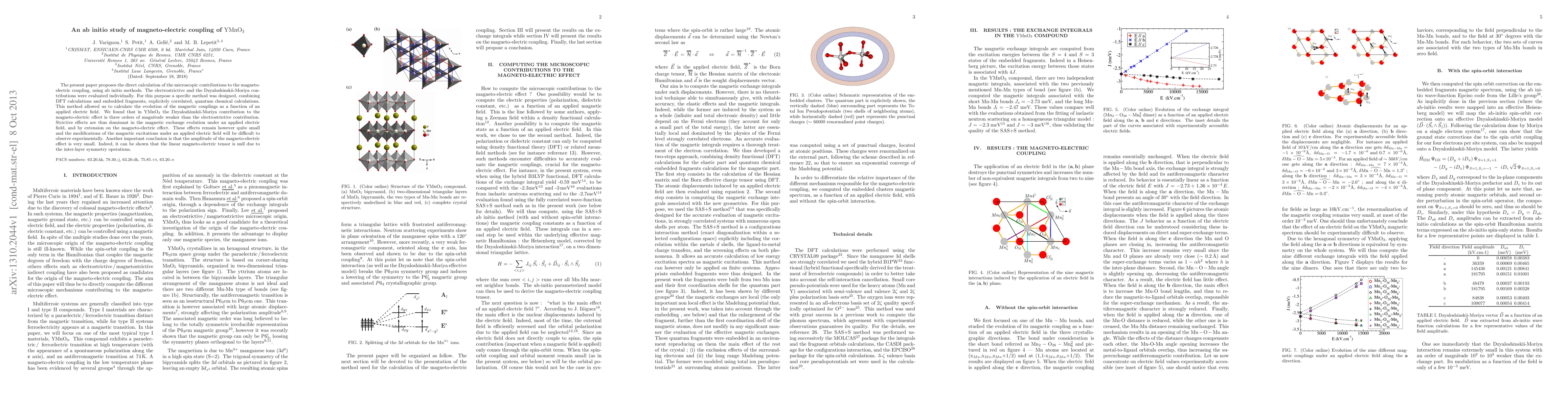 The present paper proposes the direct calculation of the microscopic contributions to the magneto-electric coupling, using ab initio methods. The electrostrictive and the Dzyaloshinskii-Moriya contributions were evaluated individually. For this purpose a specific method was designed, combining DFT calculations and embedded fragments, explicitely correlated, quantum chemical calculations. This method allowed us to calculate the evolution of the magnetic couplings as a function of an applied electric field. We found that in $\rm YMnO_3$ the Dzyaloshinskii-Moriya contribution to the magneto-electric effect is three orders of magnitude weaker than the electrostrictive contribution. Strictive effects are thus dominant in the magnetic exchange evolution under an applied electric field, and by extension on the magneto-electric effect. These effects remain however quite small and the modifications of the magnetic excitations under an applied electric field will be difficult to observe experimentally. Another important conclusion is that the amplitude of the magneto-electric effect is very small. Indeed, it can be shown that the linear magneto-electric tensor is null due to the inter-layer symmetry operations.