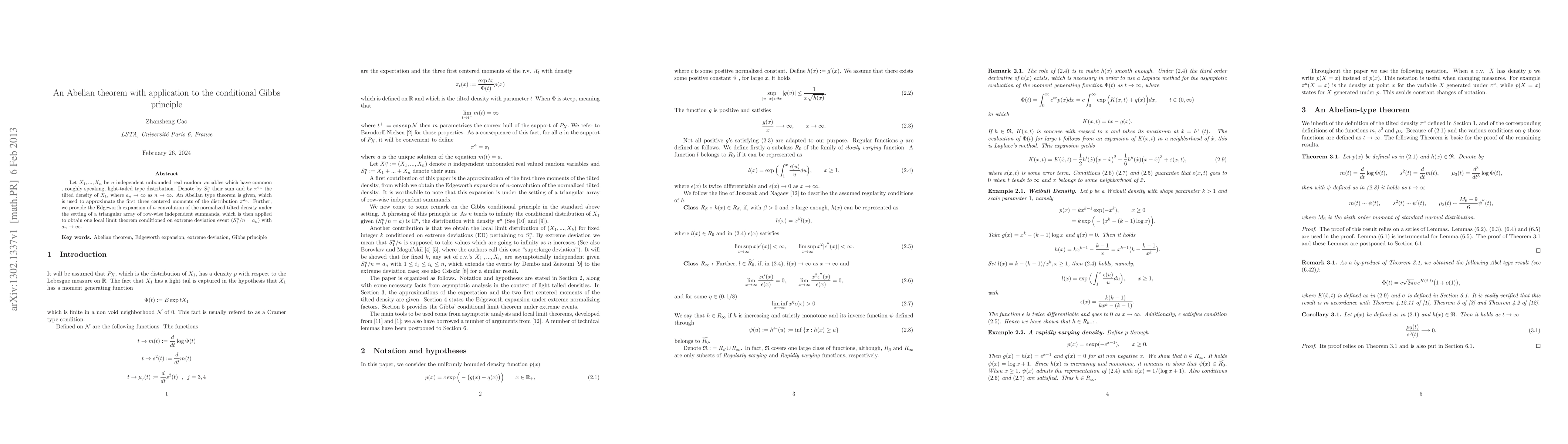 Let $X_1,...,X_n$ be $n$ independent unbounded real random variables which have common, roughly speaking, light-tailed type distribution. Denote by $S_1^n$ their sum and by $\pi^{a_n}$ the tilted density of $X_1$, where $a_n \rightarrow\infty$ as $n\rightarrow \infty$. An Abelian type theorem is given, which is used to approximate the first three centered moments of the distribution $\pi^{a_n}$. Further, we provide the Edgeworth expansion of $n$-convolution of the normalized tilted density under the setting of a triangular array of row-wise independent summands, which is then applied to obtain one local limit theorem conditioned on extreme deviation event $(S_1^n/n=a_n)$ with $a_n\rightarrow \infty$.