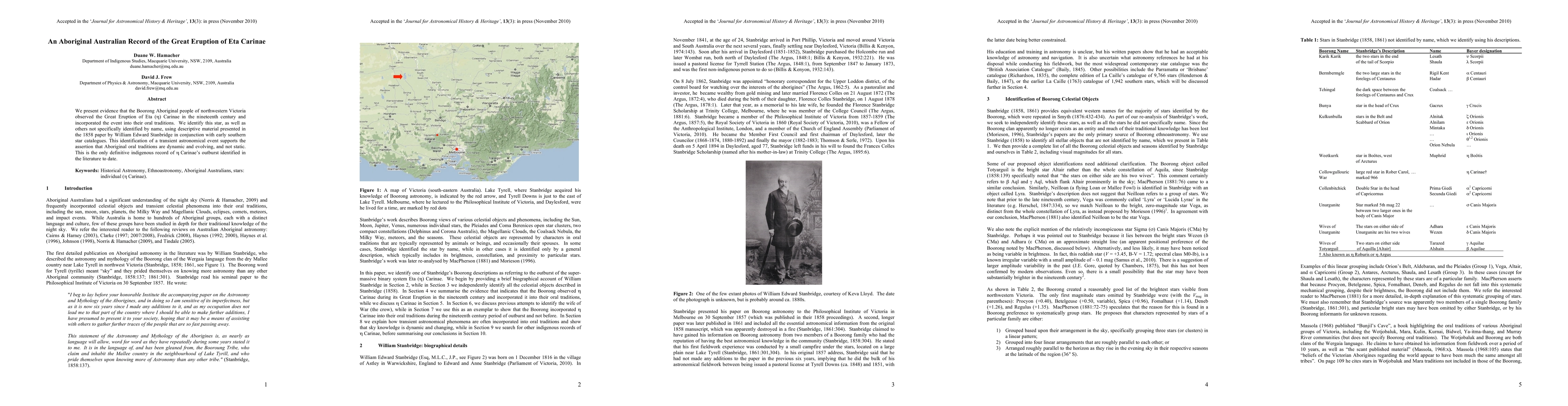 We present evidence that the Boorong Aboriginal people of northwestern Victoria observed the Great Eruption of Eta ({\eta}) Carinae in the nineteenth century and incorporated the event into their oral traditions. We identify this star, as well as others not specifically identified by name, using descriptive material presented in the 1858 paper by William Edward Stanbridge in conjunction with early southern star catalogues. This identification of a transient astronomical event supports the assertion that Aboriginal oral traditions are dynamic and evolving, and not static. This is the only definitive indigenous record of {\eta} Carinae's outburst identified in the literature to date.