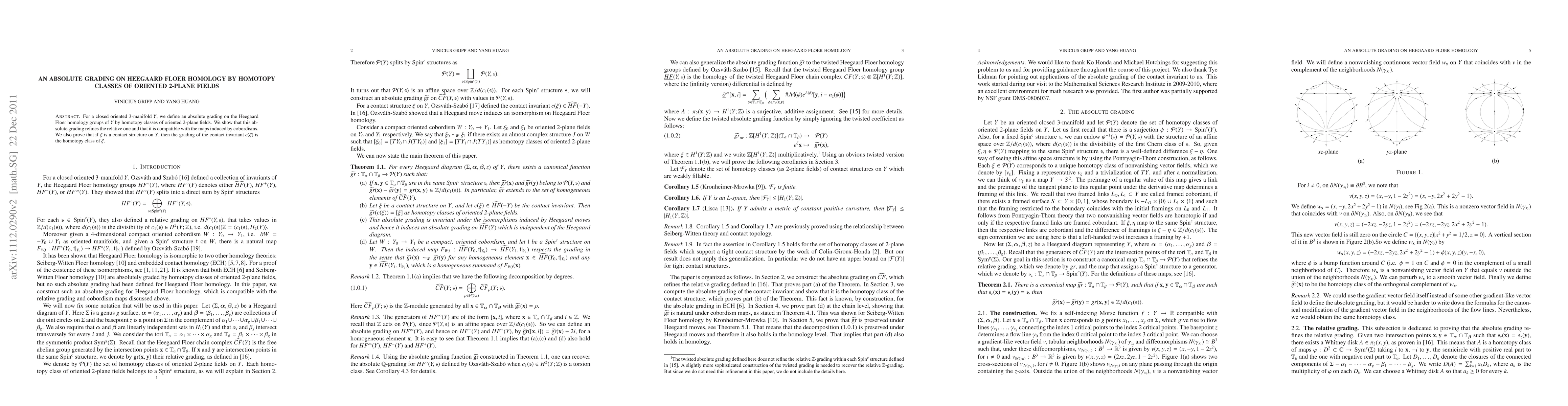 The paper introduces an absolute grading on Heegaard Floer homology based on homotopy classes of oriented 2-plane fields, demonstrating its refinement of the relative grading and compatibility with cobordism maps. It also establishes that the contact invariant's grading corresponds to the homotopy class of a contact structure.