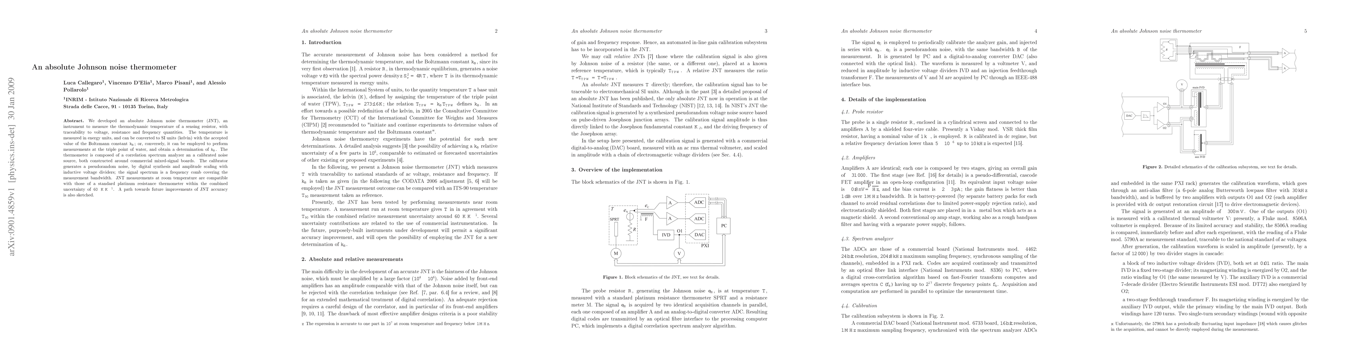 We developed an absolute Johnson noise thermometer (JNT), an instrument to measure the thermodynamic temperature of a sensing resistor, with traceability to voltage, resistance and frequency quantities. The temperature is measured in energy units, and can be converted to SI units (kelvin) with the accepted value of the Boltzmann constant kb; or, conversely, it can be employed to perform measurements at the triple point of water, and obtain a determination of kb. The thermometer is composed of a correlation spectrum analyzer an a calibrated noise source, both constructed around commercial mixed-signal boards. The calibrator generates a pseudorandom noise, by digital synthesis and amplitude scaling with inductive voltage dividers; the signal spectrum is a frequency comb covering the measurement bandwidth. JNT measurements at room temperature are compatible with those of a standard platinum resistance thermometer within the combined uncertainty of 60 ppm. A path towards future improvements of JNT accuracy is also sketched.