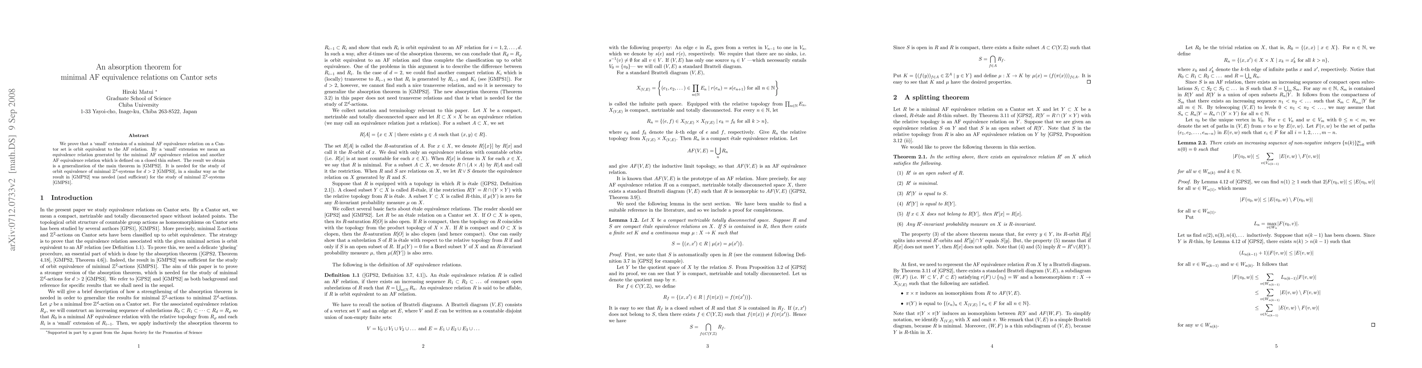 We prove that a `small' extension of a minimal AF equivalence relation on a Cantor set is orbit equivalent to the AF relation. By a `small' extension we mean an equivalence relation generated by the minimal AF equivalence relation and another AF equivalence relation which is defined on a closed thin subset. The result we obtain is a generalization of the main theorem in [GMPS2].
