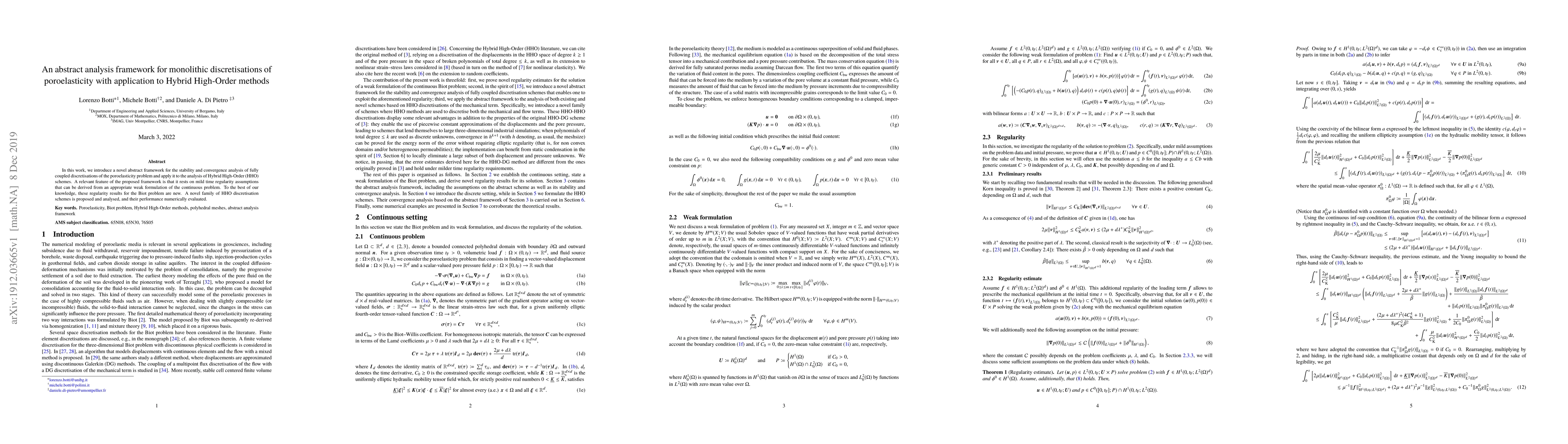 This paper introduces an abstract analysis framework for stability and convergence of poroelasticity discretisations, focusing on Hybrid High-Order schemes with mild time regularity assumptions. The framework provides new results for the Biot problem and numerically evaluates the performance of novel HHO scheme families.