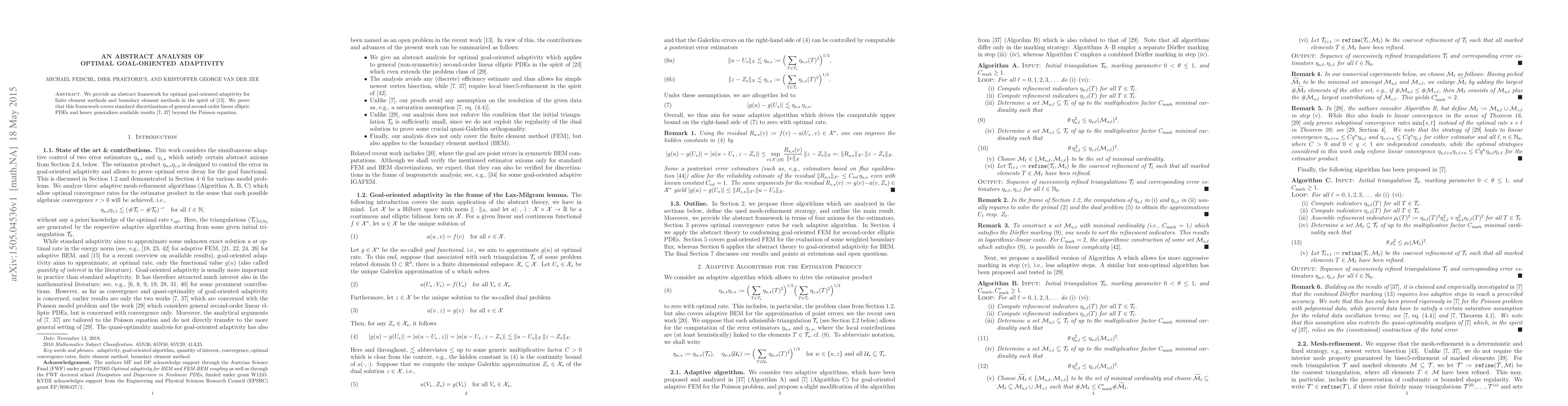 This paper presents an abstract framework for optimal goal-oriented adaptivity in finite and boundary element methods, extending previous results to cover general second-order linear elliptic PDEs beyond the Poisson equation. The framework generalizes existing approaches and applies to standard discretizations.