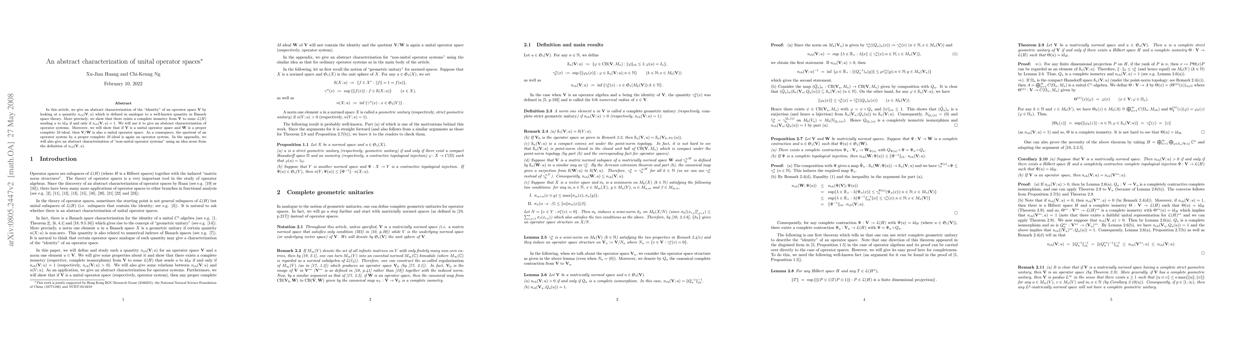 This paper provides an abstract characterization of unital operator spaces through the quantity $n_{cb}(V,u)$, showing that a complete isometry from $V$ to $\mathcal{L}(H)$ mapping $u$ to ${\rm id}_H$ exists if and only if $n_{cb}(V,u) = 1$. It also demonstrates that the quotient of a unital operator space by a proper complete $M$-ideal remains a unital operator space.
