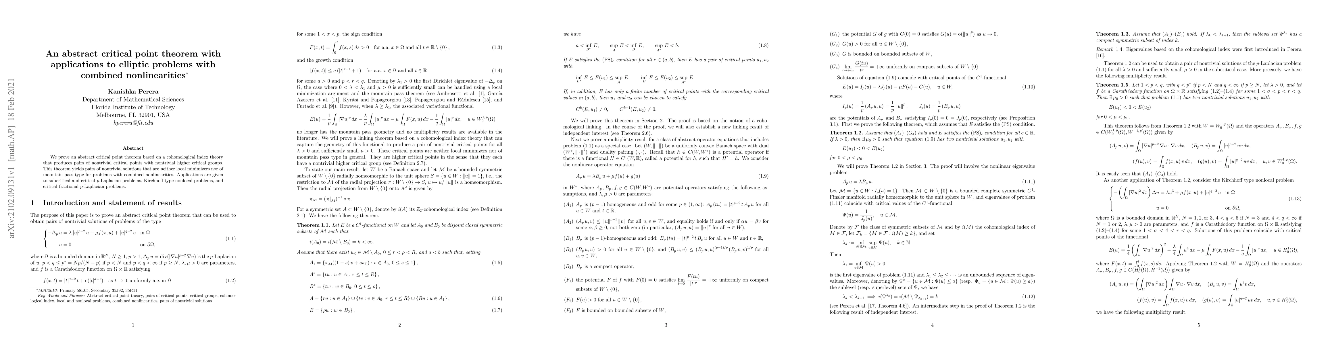 This paper proves an abstract critical point theorem using cohomological index theory to generate pairs of nontrivial critical points for elliptic problems with combined nonlinearities, with applications to subcritical and critical $p$-Laplacian, Kirchhoff type, and critical fractional $p$-Laplacian problems.
